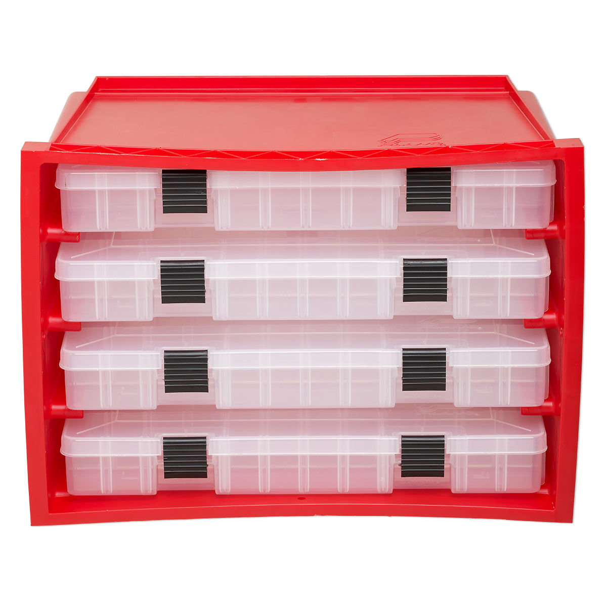 Keep all your beading supplies in one place with Plano® StowAway® organizers. The organizers are a fashionable Porsche red color with four clear boxes holding up to 24 adjustable compartments in each. Stackable and wall-mountable. Made of a durable, impact-resistant plastic. Color of latches may vary.