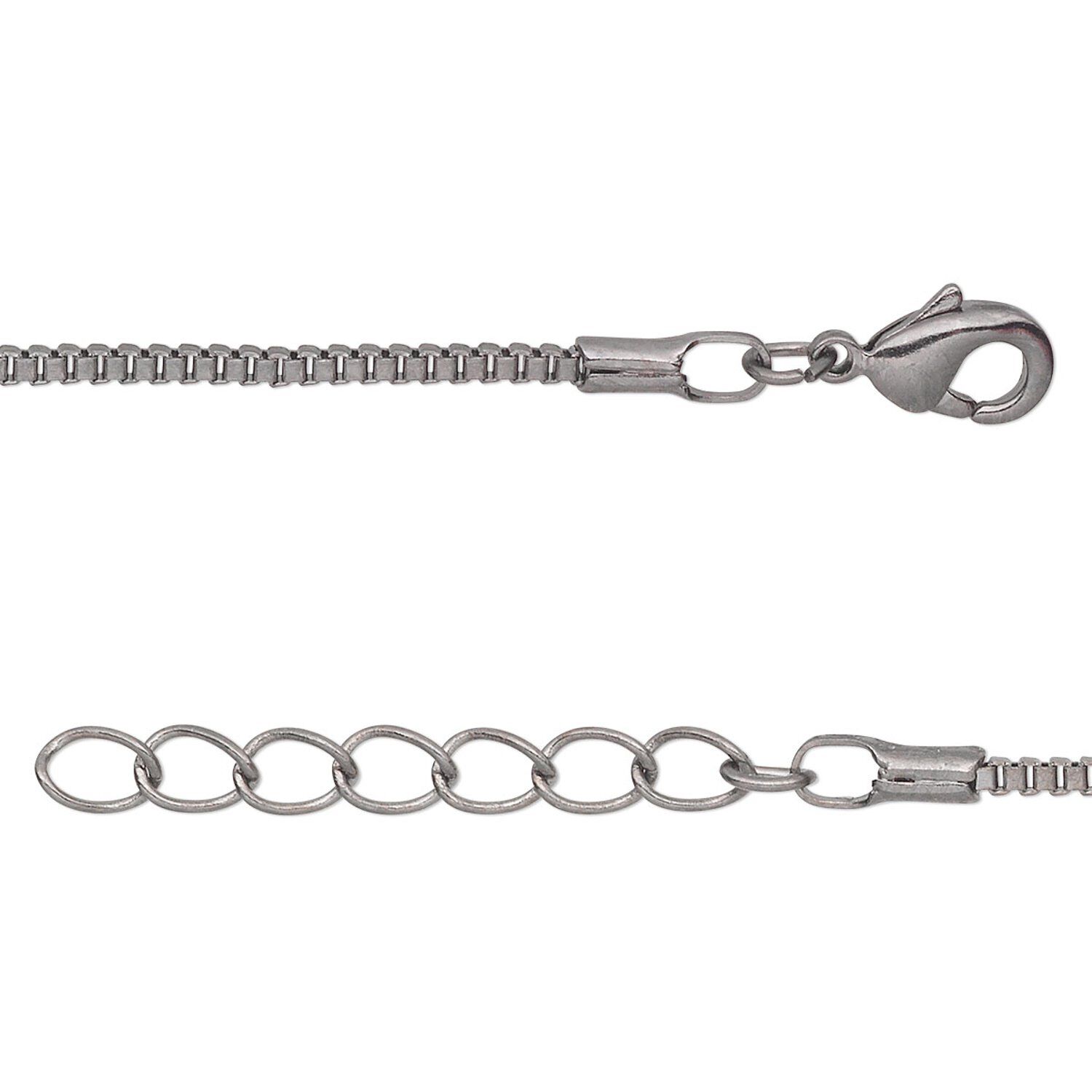 Chain, gunmetal-plated brass, 1.5mm Venetian box, 16 inches with 1-inch extender chain and lobster claw clasp. Sold per pkg of 4.