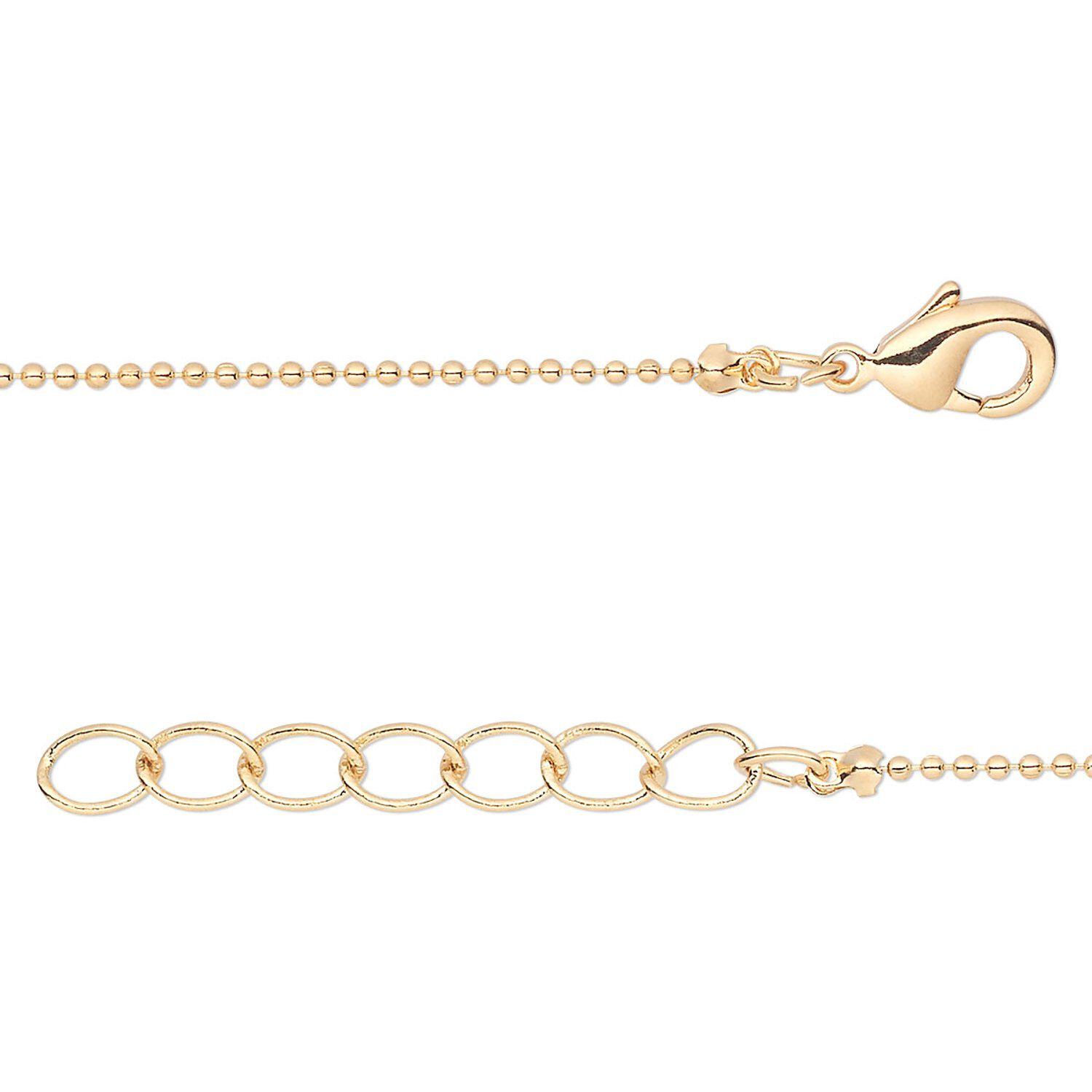 Chain, gold-finished brass, 1mm ball, 7-1/2 inches with 1-1/4 inch extender chain and lobster claw clasp. Sold per pkg of 6.