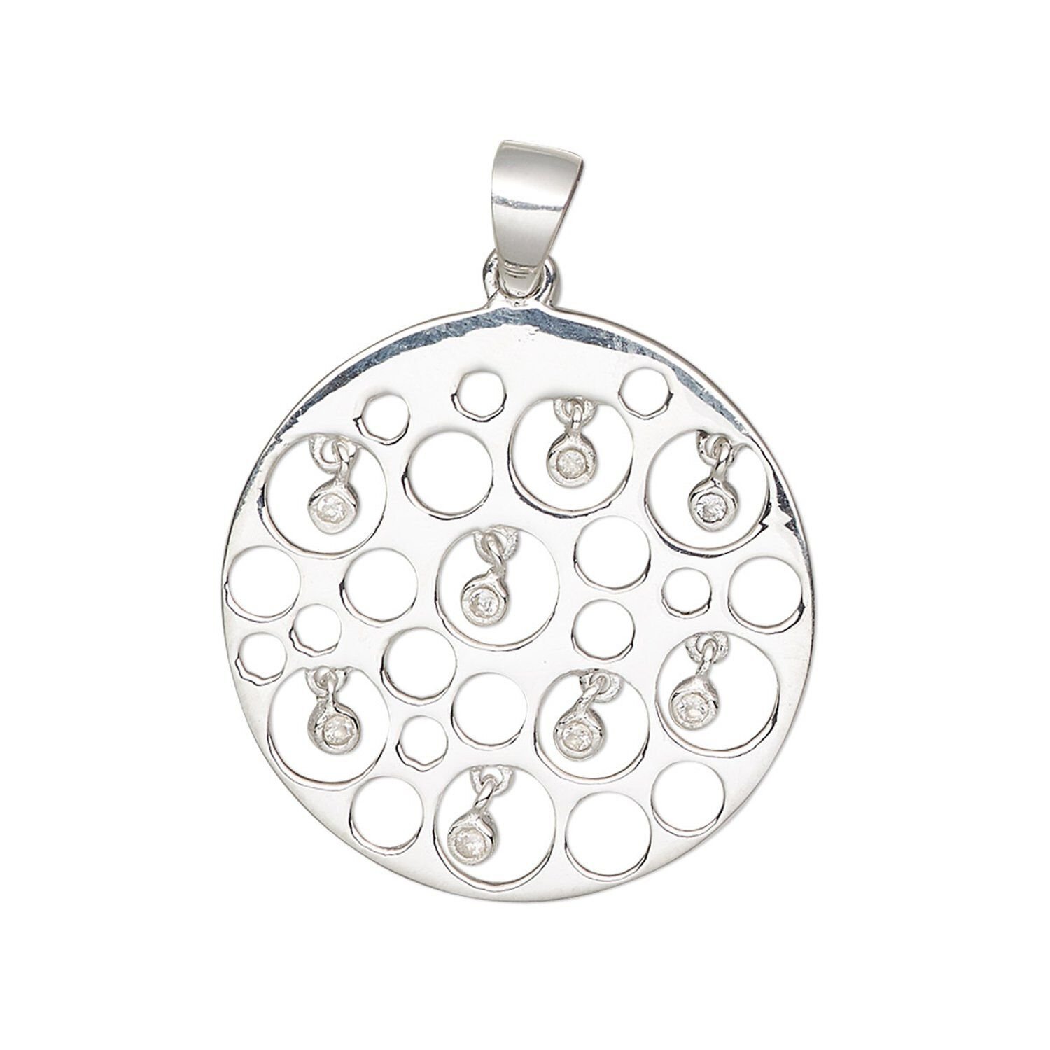 Pendant, cubic zirconia and sterling silver, clear, 25mm single-sided round with cutout and dangles. Sold individually.