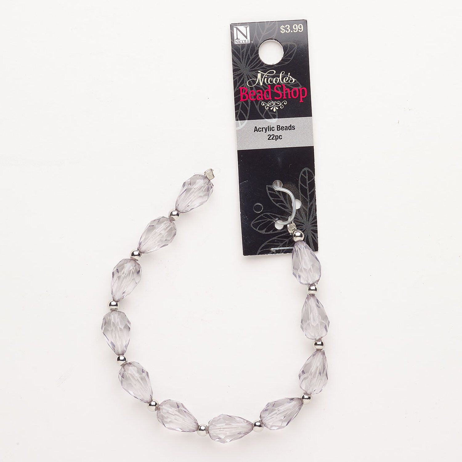 Bead, brass and acrylic, pkg/22, silver finish and grey, 4mm round and 15x9mm faceted teardrop.