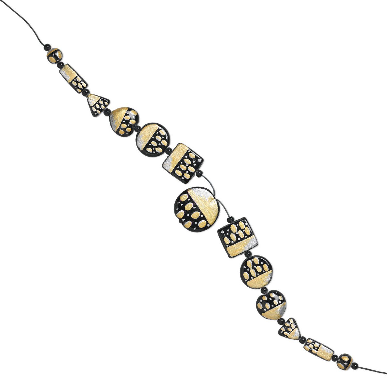 Bead set, glass and waxed cotton cord, gold / black / silver, (1) 35mm round, (2) 25x25mm square, (2) 25mm flat round, (2) 22x21mm puffed heart, (2) 18x18x17mm triangle, (2) 24x10mm rectangle, (2) 12mm round, (12) 5-6mm spacers, double-sided, 16-inches. Sold per 13-piece set.