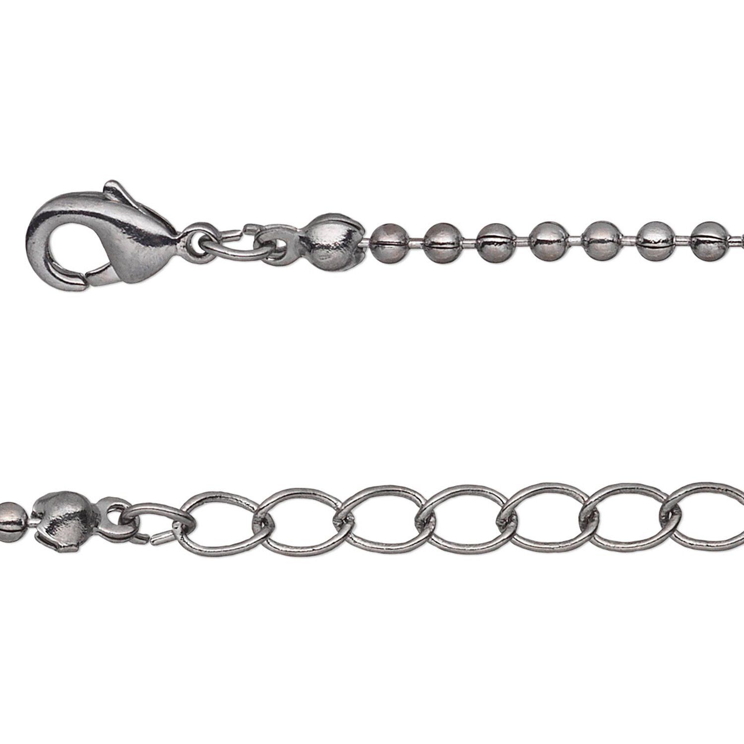 Chain, gunmetal-plated brass, 2mm ball, 16 inches with 1-inch extender chain and lobster claw clasp. Sold per pkg of 4.