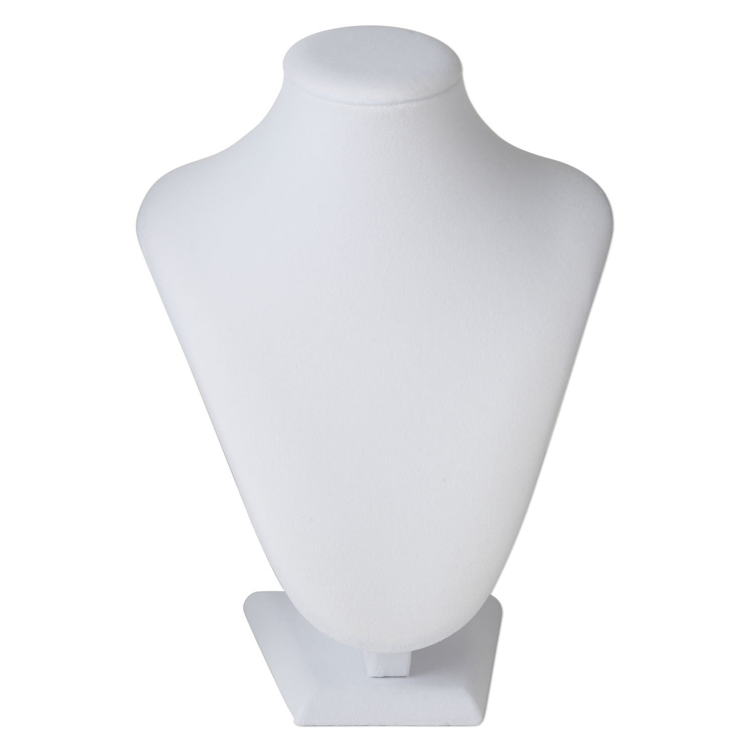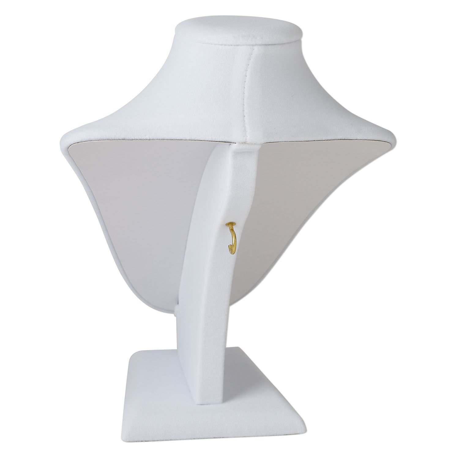 Upright, décolleté-style necklace display gives your design the attention it deserves. Velveteen makes gold, silver and gemstone jewelry stand out from the crowd. A hook in back secures necklace in place and offer versatile positioning.
