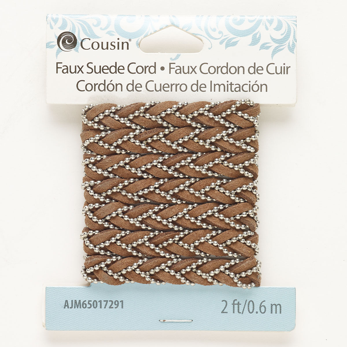 Cord, steel and faux leather (dyed), pkg/2 feet, silver finish and brown, 7mm braided.