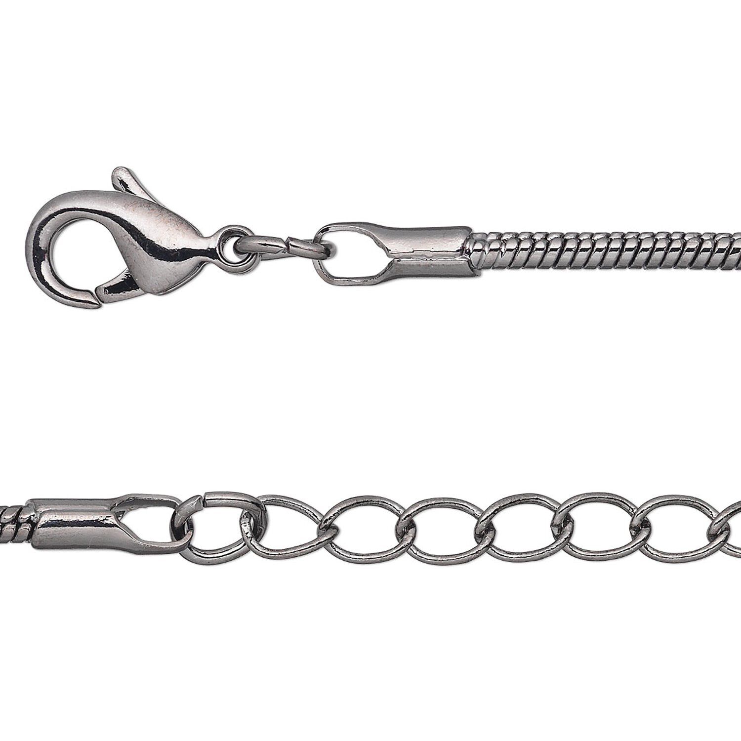 Chain, gunmetal-plated brass, 2mm snake, 16 inches with 1-inch extender chain and lobster claw clasp. Sold per pkg of 4.
