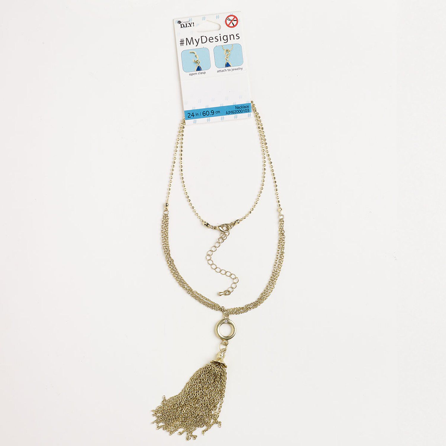 Necklace, steel and glass, pkg/24 inches, gold finish and clear, mixed chain, 4-inch chain tassel with lobster claw clasp and extender chain.