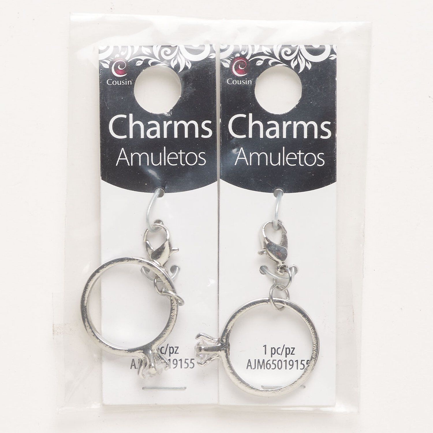 Charm, "pewter" (zinc-based alloy) / steel / glass, pkg/2, silver finish and clear, 27x22mm engagement ring with lobster claw clasp.