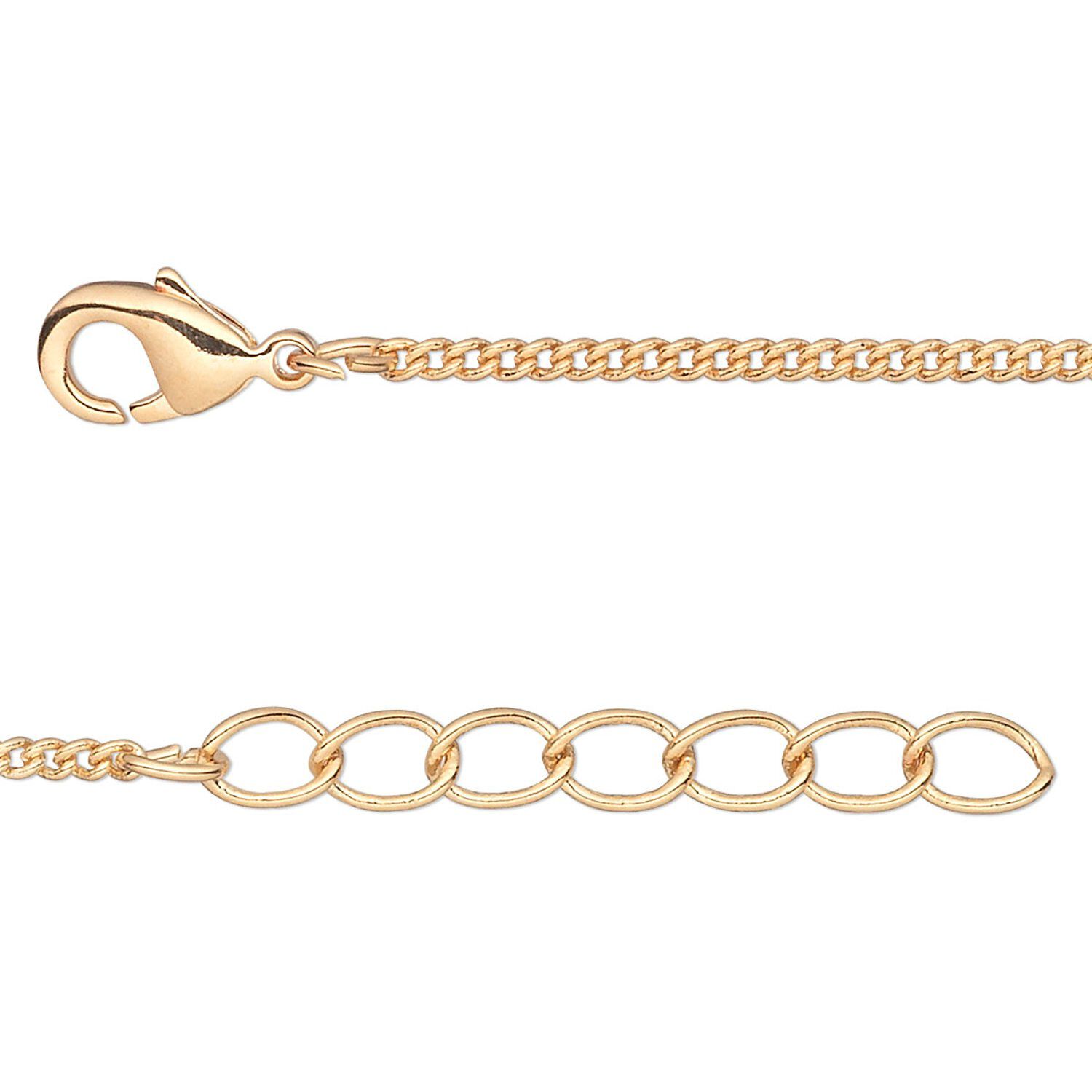 Chain, gold-finished brass, 1.5mm curb, 18 inches with 1-1/4 inch extender chain and lobster claw clasp. Sold per pkg of 4.