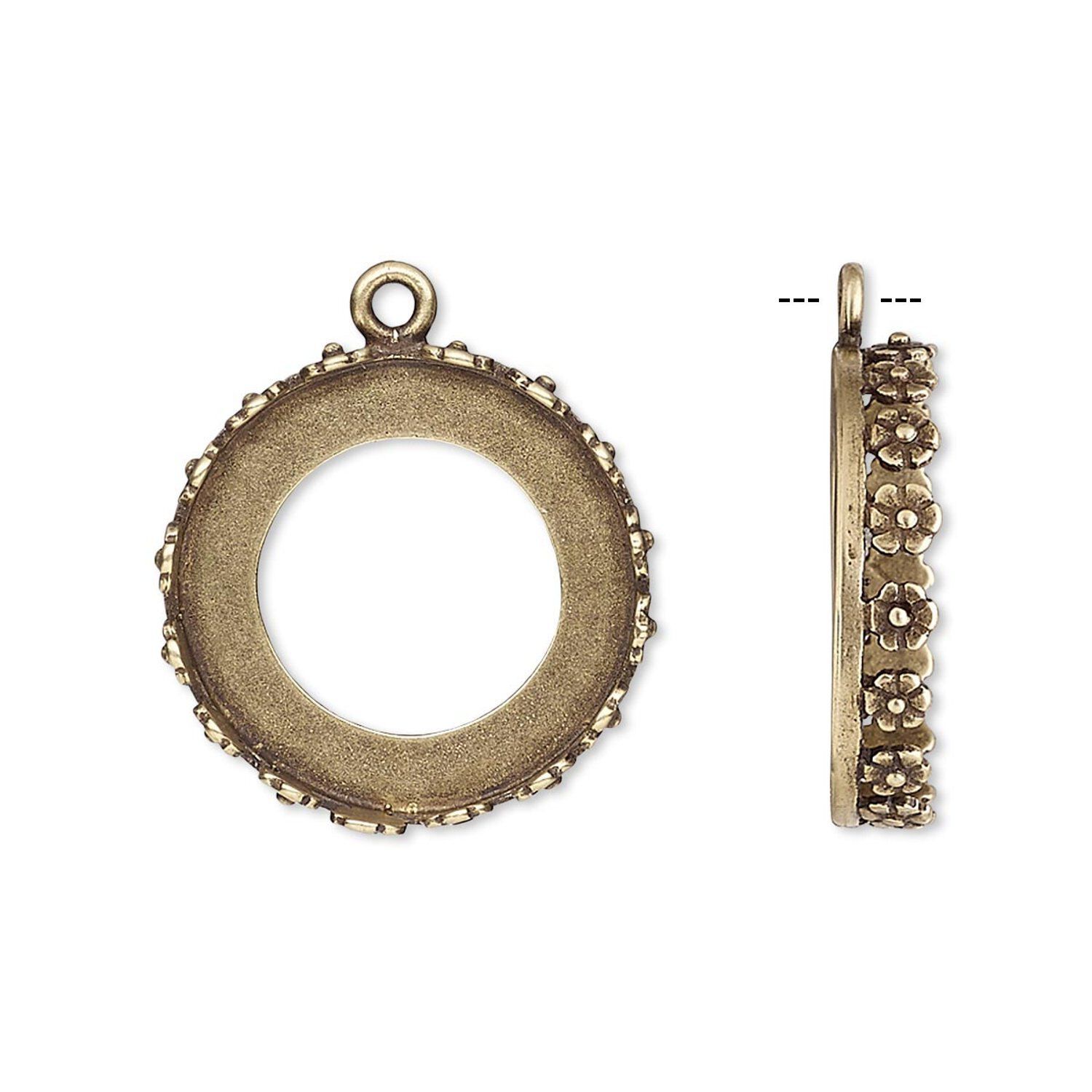 Drop, JBB Findings, antiqued brass, 20mm round with open back and flower design trim, 18mm round bezel setting. Sold per pkg of 2.