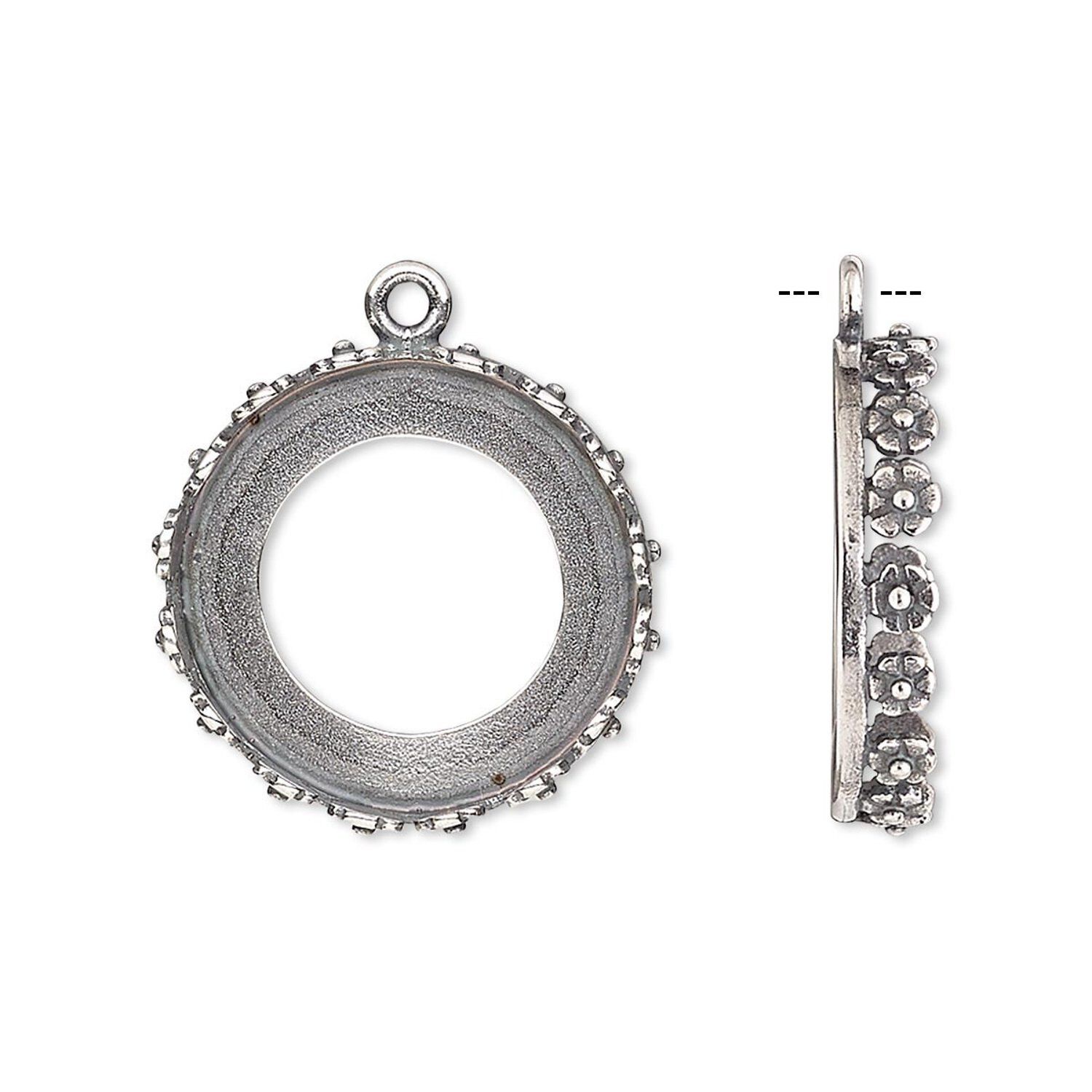 Drop, JBB Findings, antique silver-plated brass, 20mm round with open back and flower design trim, 18mm round bezel setting. Sold per pkg of 2.