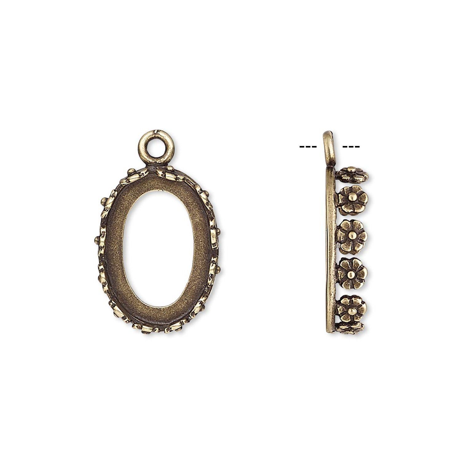 Drop, JBB Findings, antiqued brass, 16x12mm oval with open back and flower design trim, 14x10mm oval bezel setting. Sold per pkg of 2.