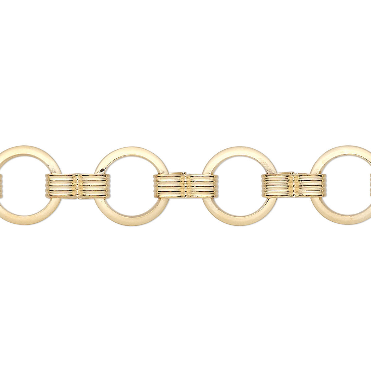Gold-plated brass chain features 8mm flat rounds that are attached with textured figure-eight connector links that open and close so no cutting is required.