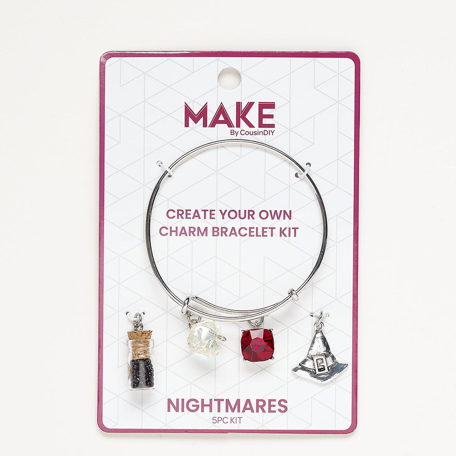 Package contains (1) bangle, (1) 21x10mm vial, (1) 13mm faceted skull, (1) 12mm square, (1) 24x21mm witch hat and (1) 1-inch tassel.