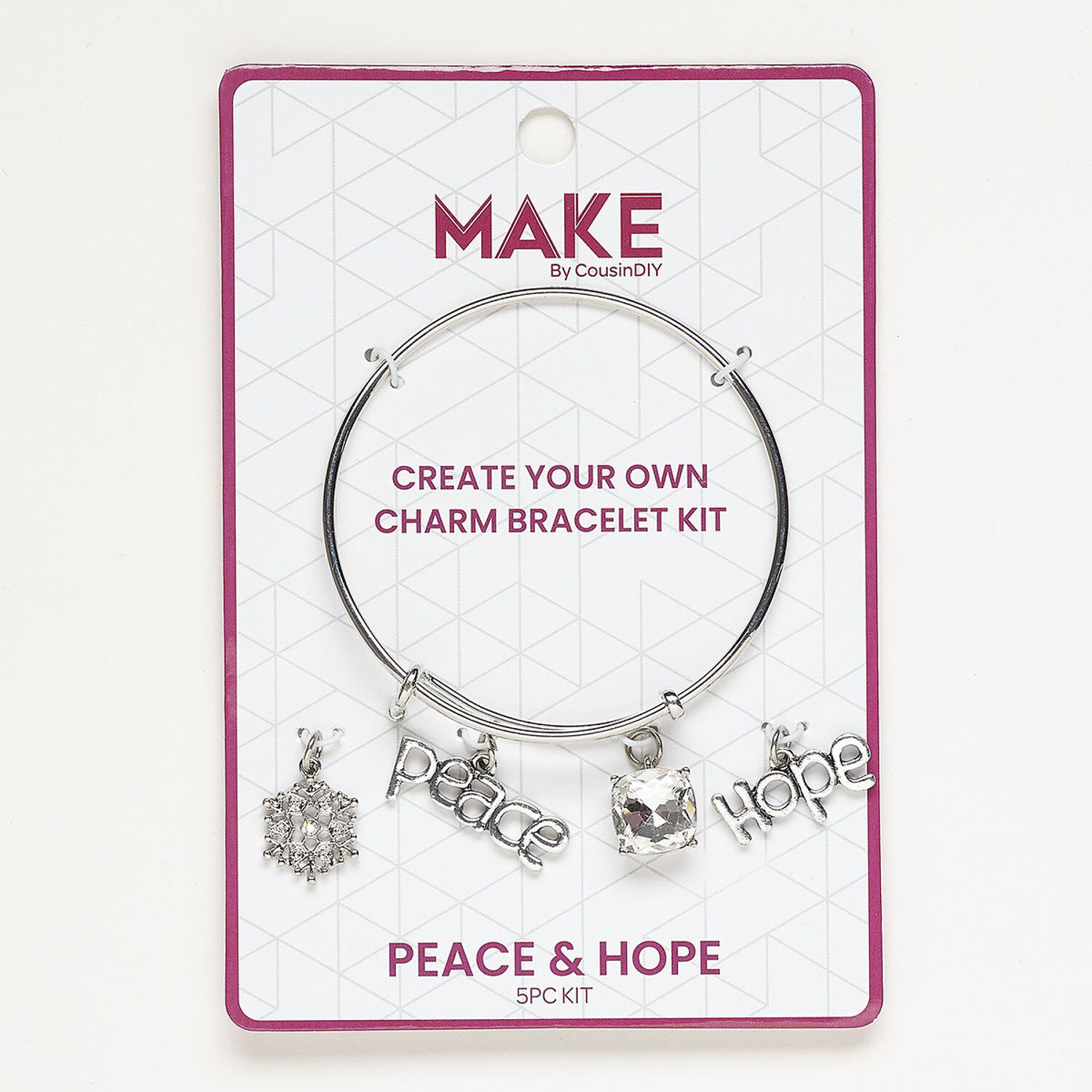 Package contains (1) bangle, (1) 27x11mm "peace," (1) 16mm snowflake, (1) 12mm square, (1) 27x11mm "Hope" and (1) 1-inch tassel.
