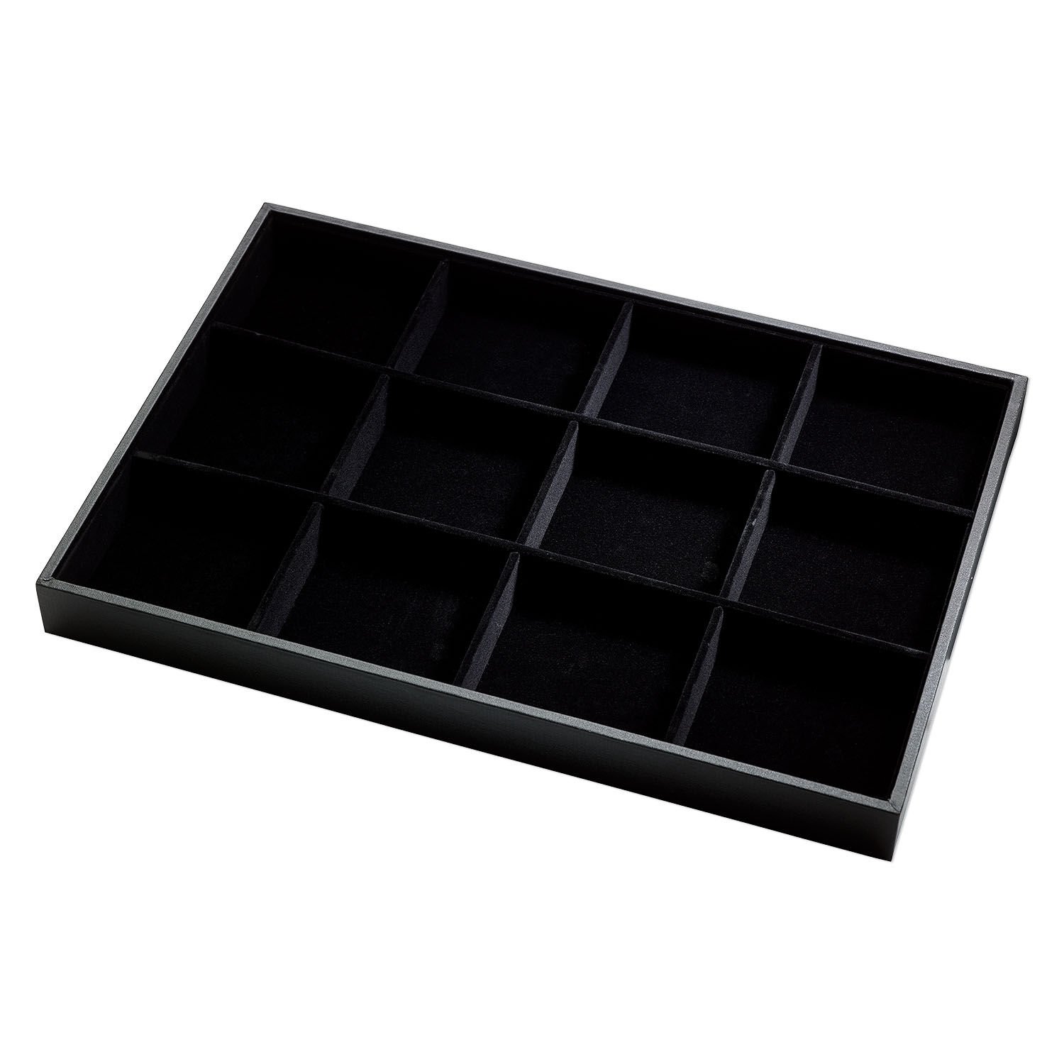 Display tray, leatherette and velveteen, black, 13-3/4 x 1-1/4 x 9-1/2 inches with 12-compartment insert. Sold individually.