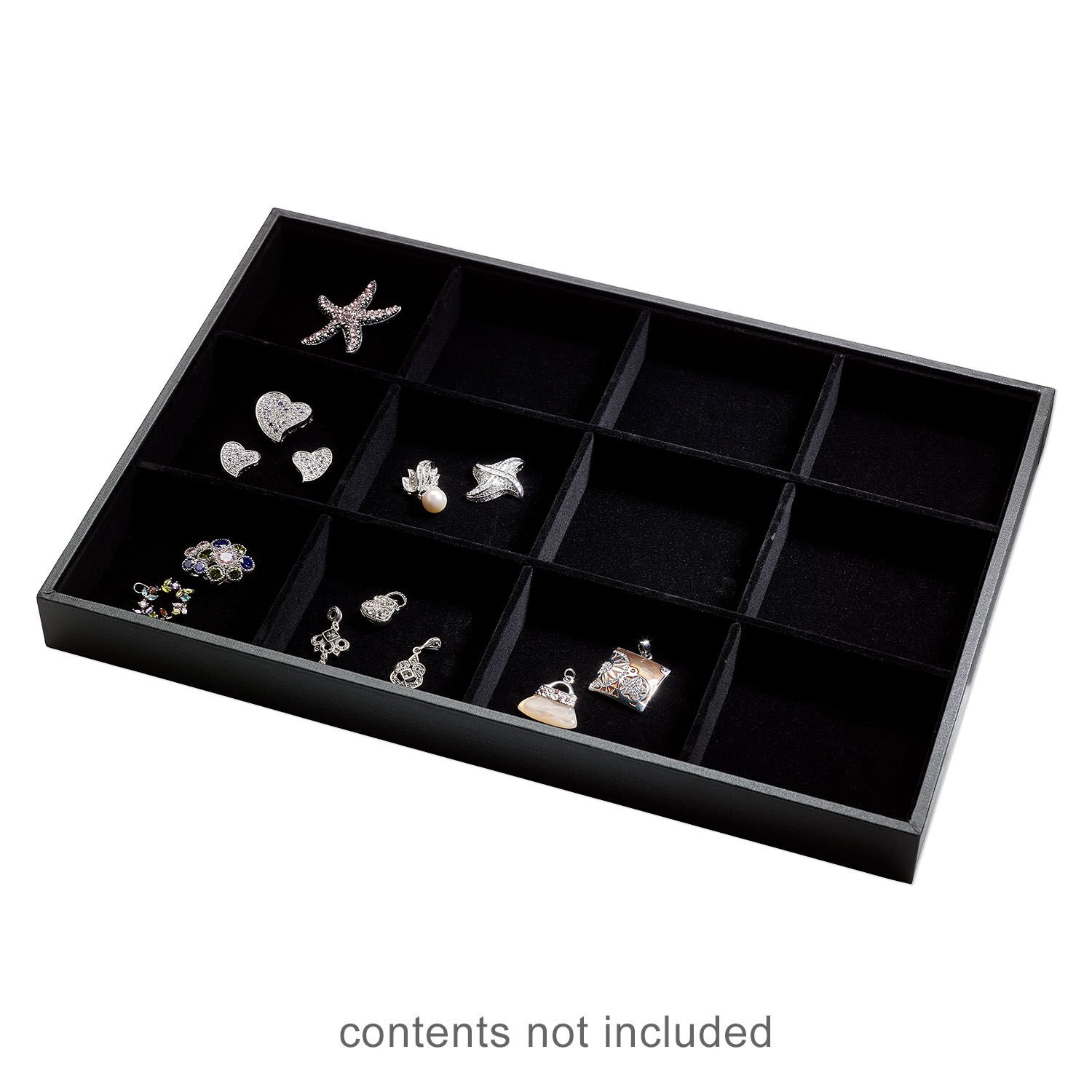 Black leatherette display trays have permanent 12-compartment velveteen insert that holds pendants, rings, earrings, charms and more. The trays conveniently stack for storage and travel. Colors, shapes and sizes may vary in each lot.