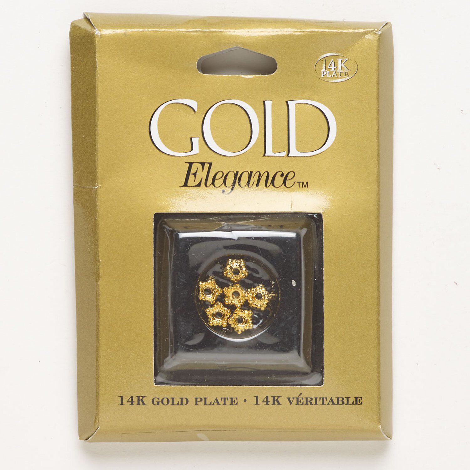 Bead cap, copper, pkg/6, gold plate, 6x3mm round beaded star, fits 4-6mm beads.
