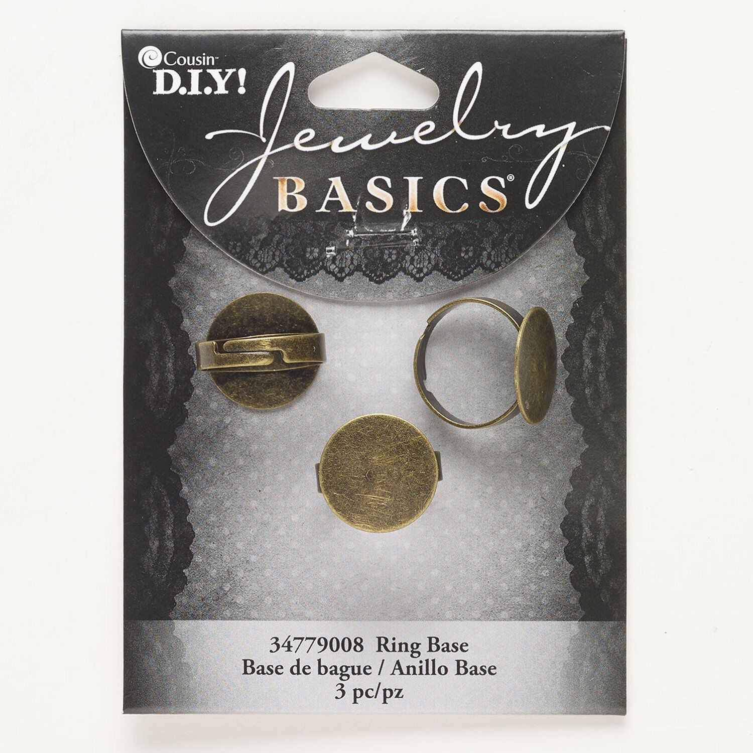 Ring, steel, pkg/3, antique brass finish, adjustable with 16mm round setting.