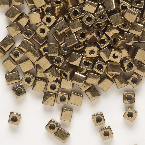 Seed bead, Miyuki, glass, pkg/25g, 3.5-3.7mm square, opaque metallic dark gold (SB-457).