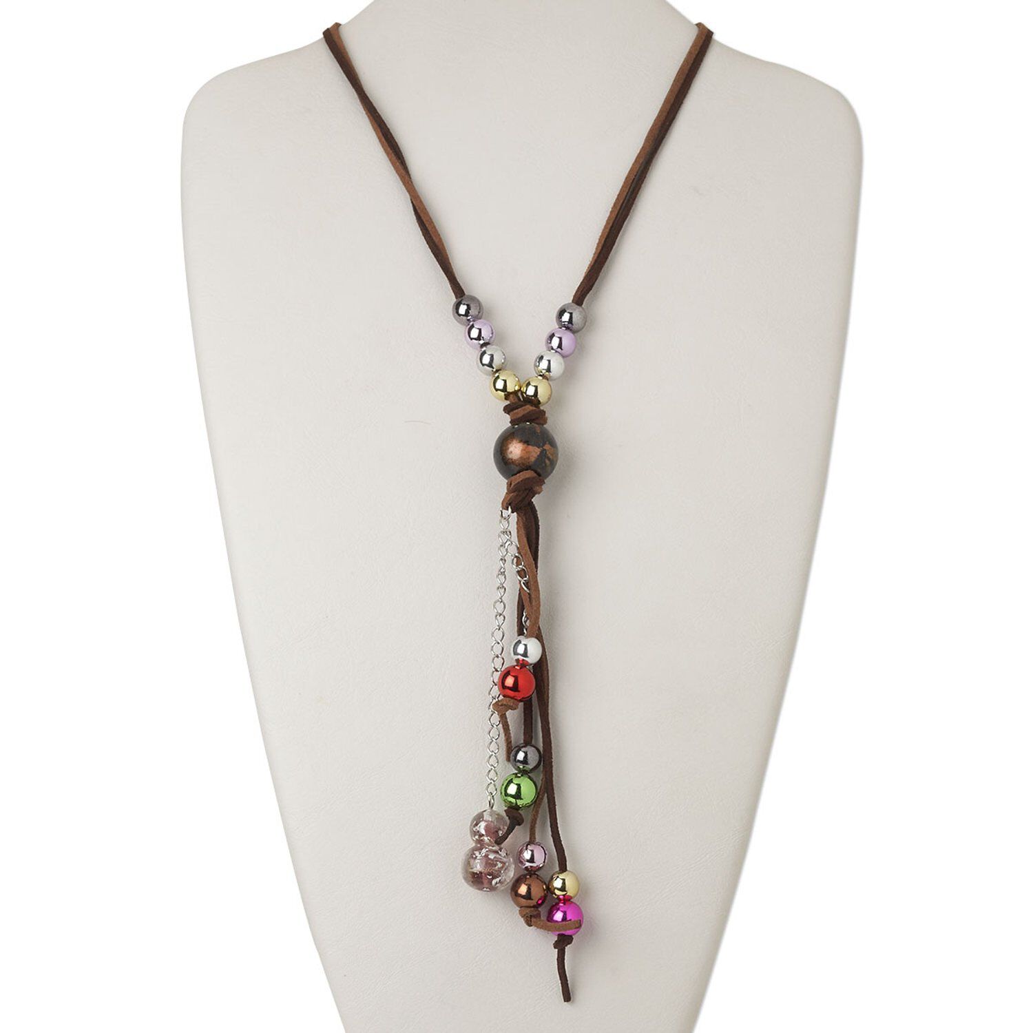 Necklace, 2-strand, lampworked glass / acrylic / velveteen / silver-finished steel, multicolored, 56 inches with 7-1/2 inch dangle and tie closure. Sold individually.