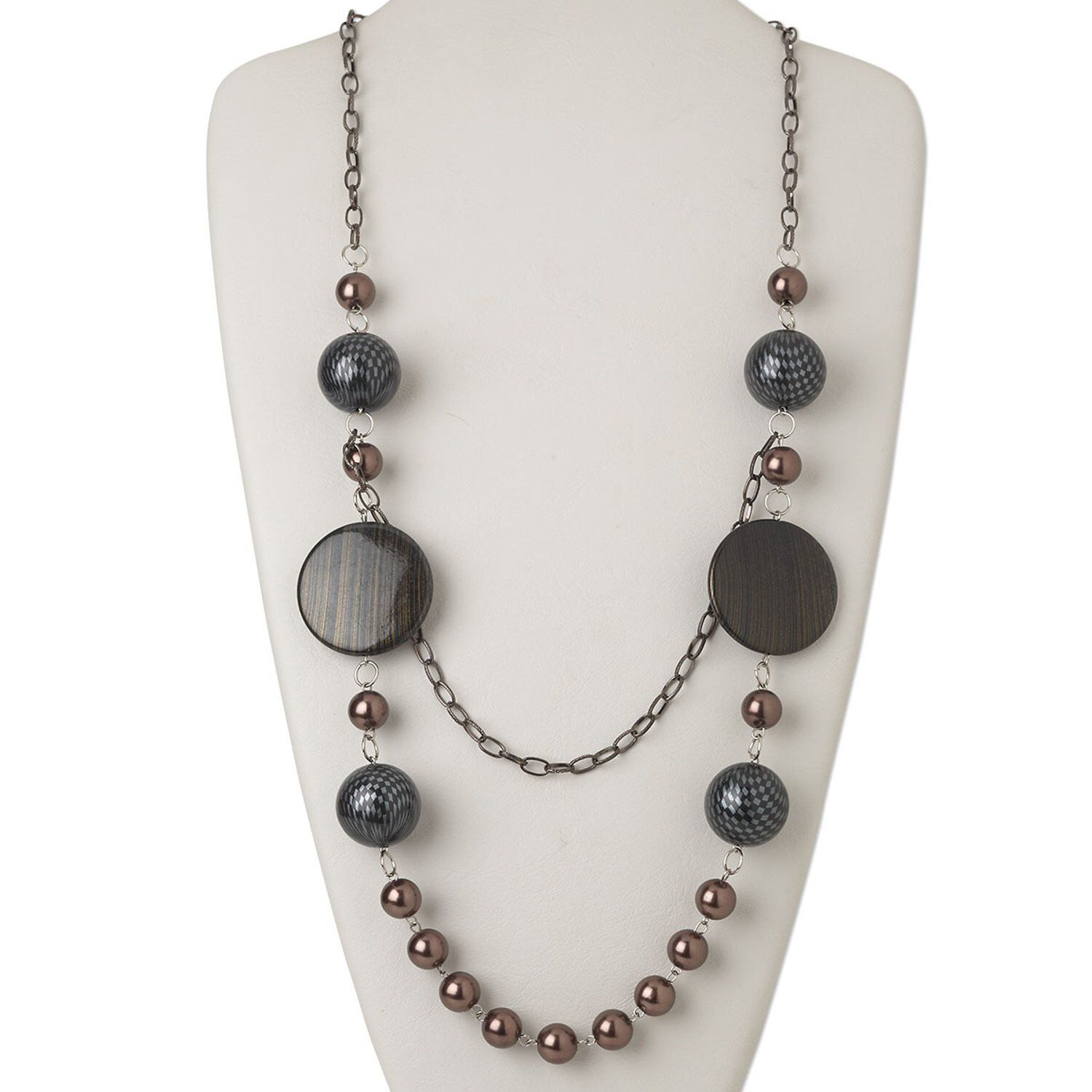 Necklace features rounds and flat rounds in grey, black, gold and copper colors. Single-strand necklace goes from two strands to one strand. The overall necklace length measures 32 inches. Colors can include grey, black, gold and brown. Colors, shapes and sizes may vary in each lot.