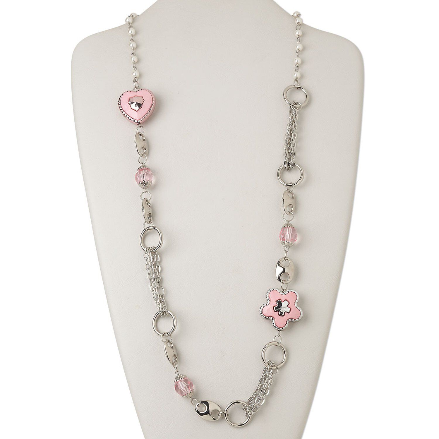 Pink glass beads, silver-finished hoops and components with playful heart and flower acrylic charms form this single-strand necklace. Colors, shapes and sizes may vary in each lot.