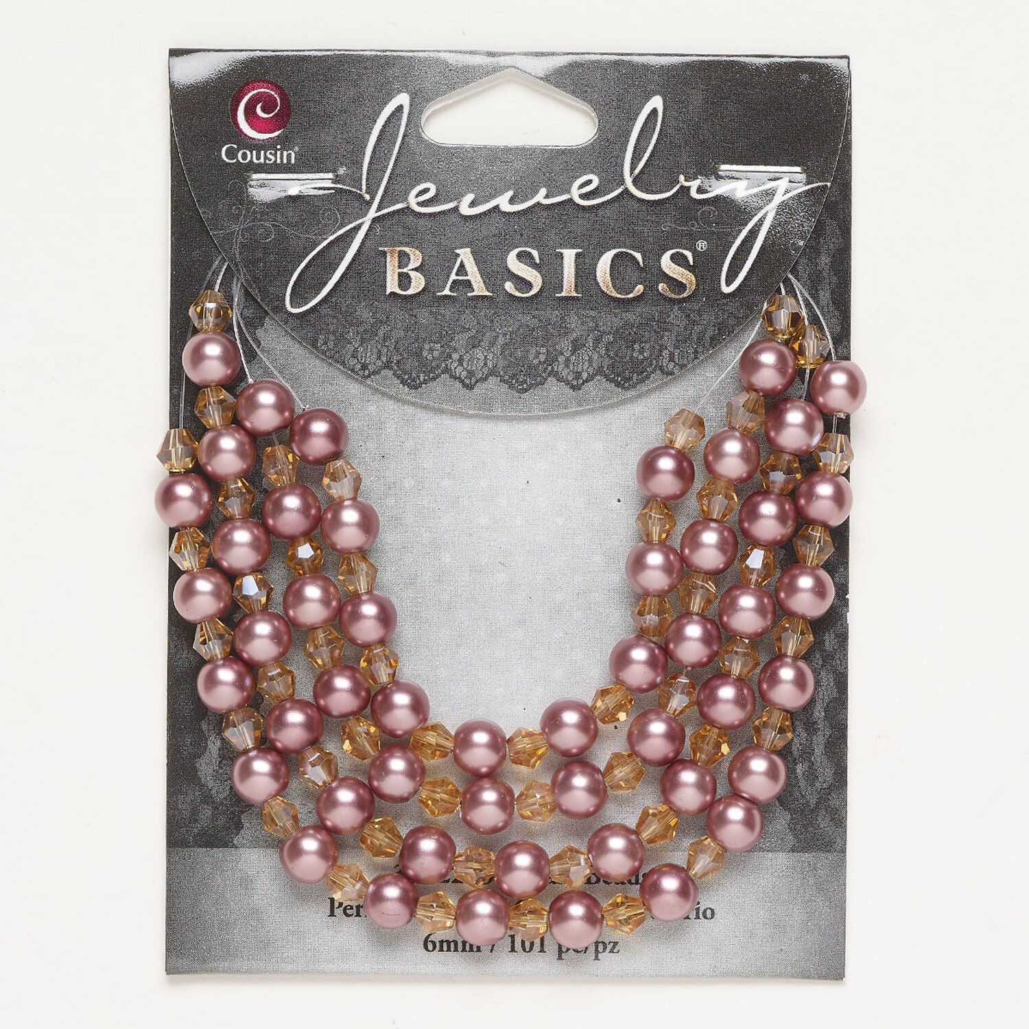 Bead assortment, glass and glass pearl, pkg/101, 4mm faceted bicone and 6mm round, antique rose peach and topaz.
