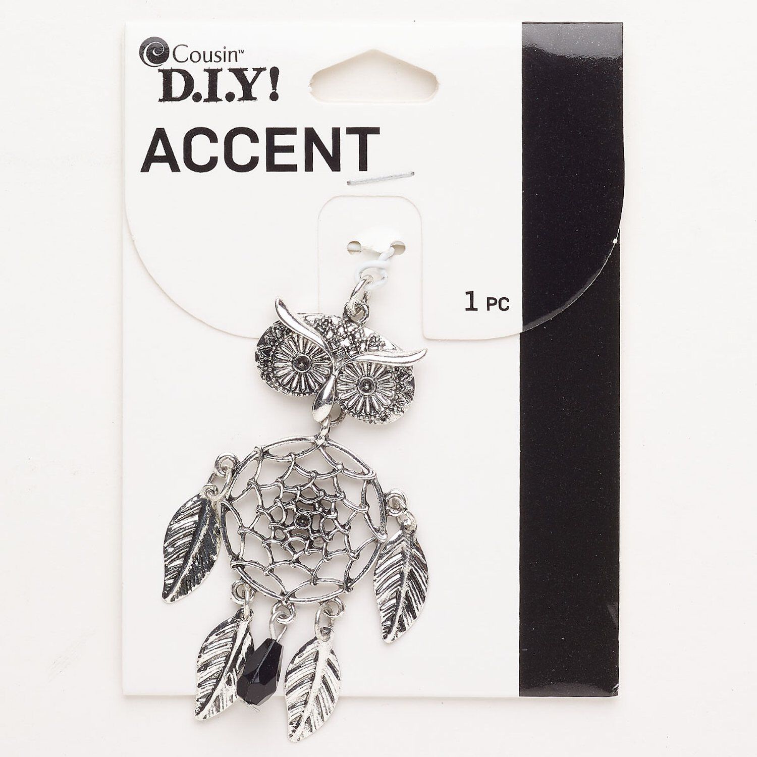 Focal, "pewter" (zinc-based alloy) / steel / acrylic, pkg/1, silver finish and black, 64x40mm dreamcatcher owl.