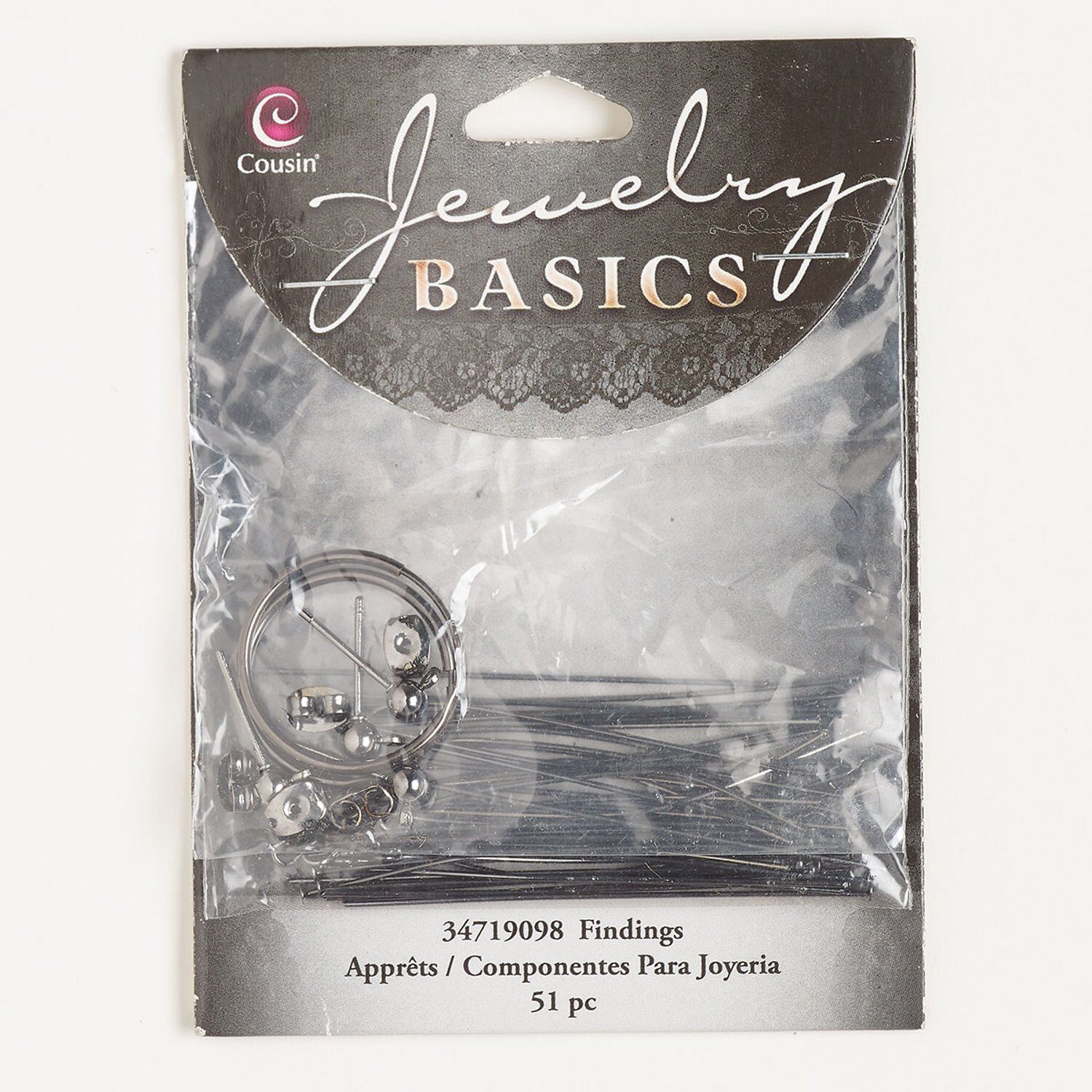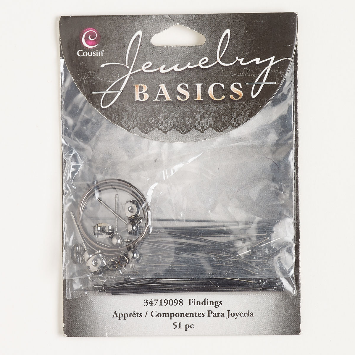 Finding and component assortment, steel, pkg/51, head pin / eye pin / earstud / earnut / earring hoop, gunmetal finish.