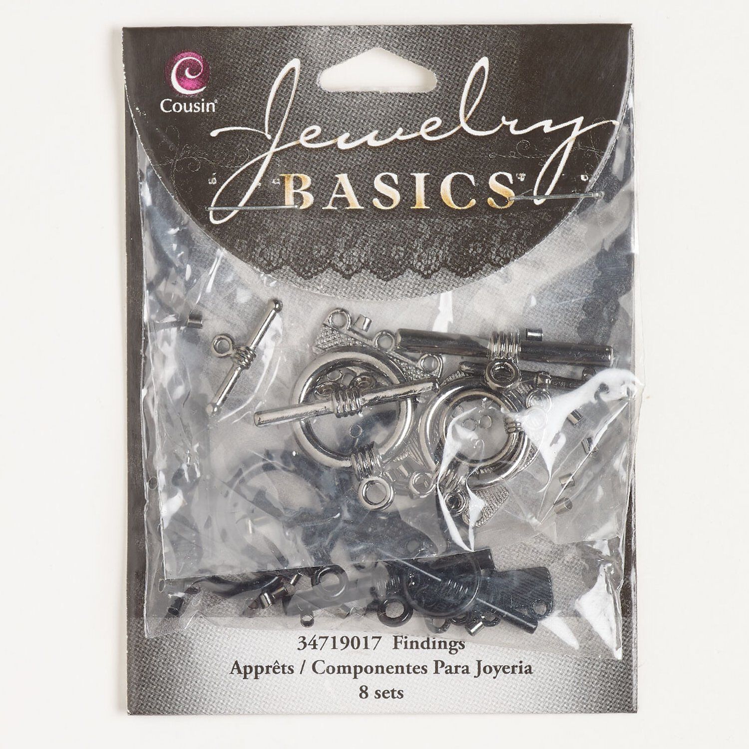 Package contains (1) toggle clasp of each finish and size and (20) 2mm crimp tubes with 1.3mm inner diameter of each finish and size. Sizes include 11mm round, 16mm round, 17mm round and 18mm round. This item may have a tarnished finish but can be cleaned with tarnish-removing cleaners.