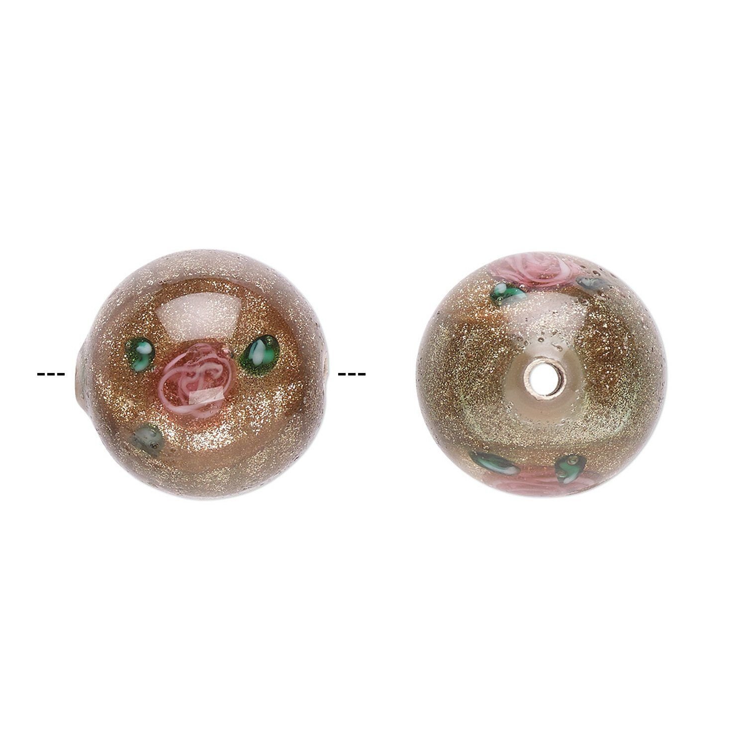 Bead, Czech lampworked glass, opaque brown / pink / green, 12-13mm round with flower design. Sold per pkg of 4.
