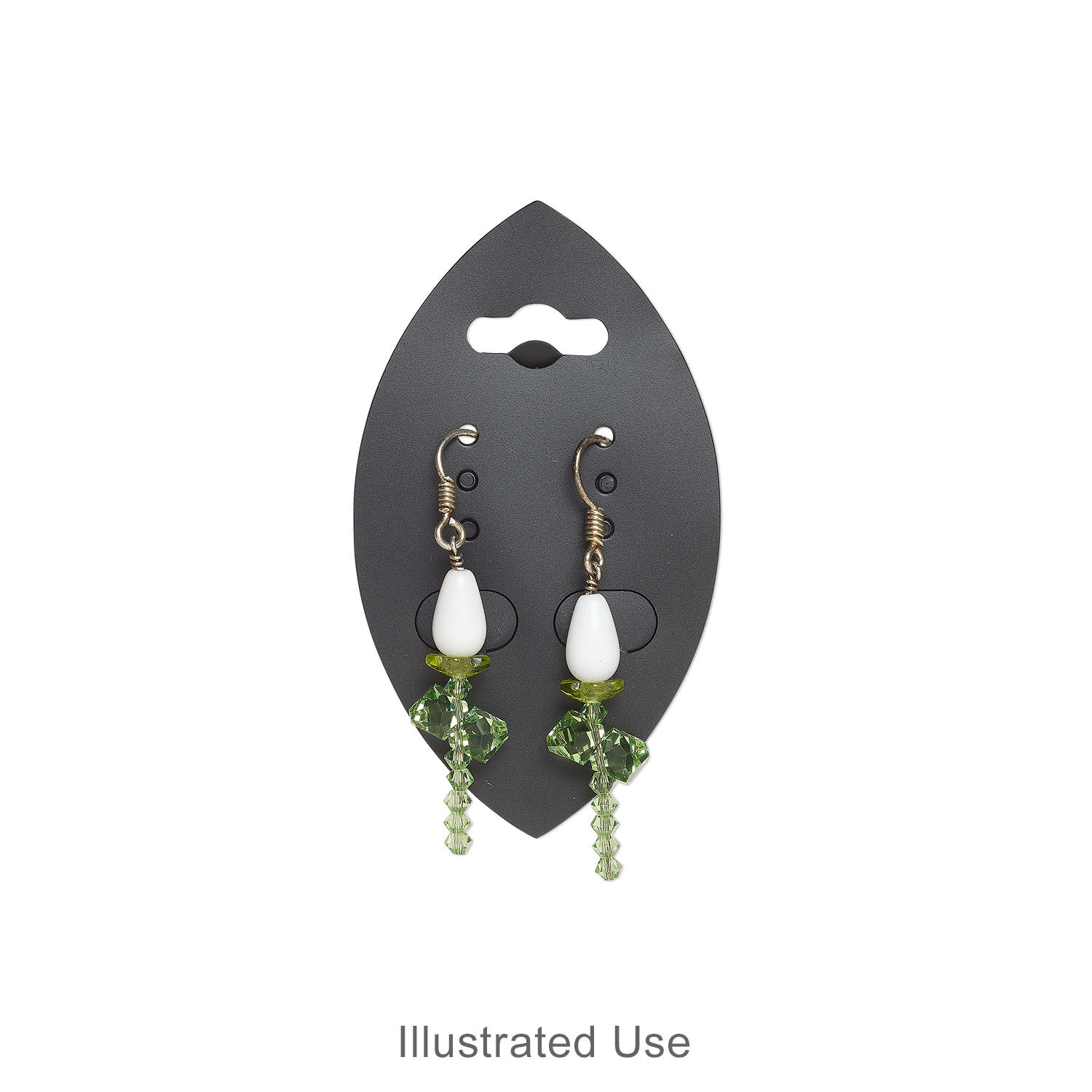 Earring cards provide an economical and effective method of displaying earrings, especially when coupled with earring display stands. Each card holds three pairs of earrings and one pair of clip-on earrings. Center hang tab fits most hooks and butterfly hangers.