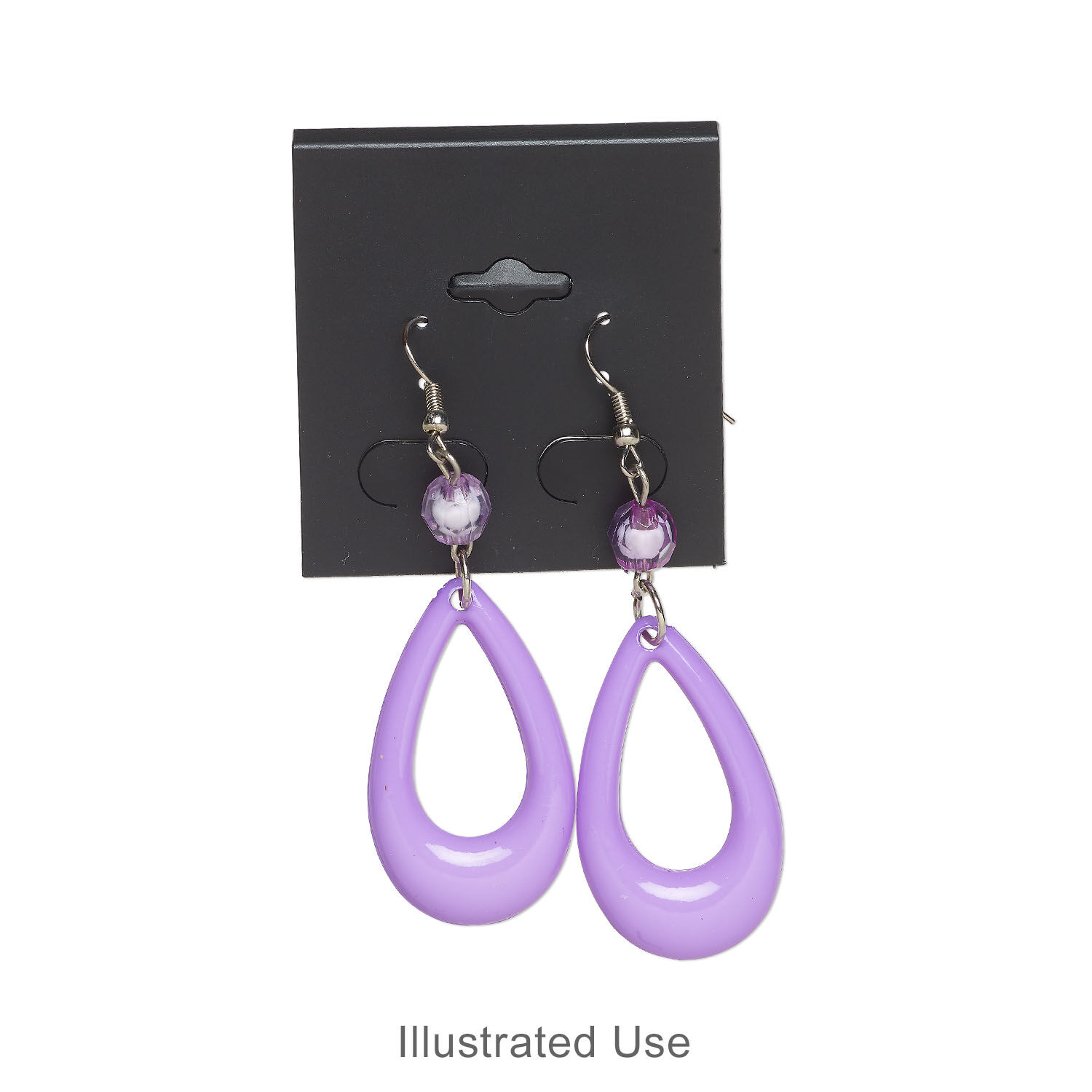 Earring cards provide an economical and effective method of displaying earrings, especially when coupled with earring display stands. Each card holds two pairs of earrings. Center hang tab fits most hooks and butterfly hangers.