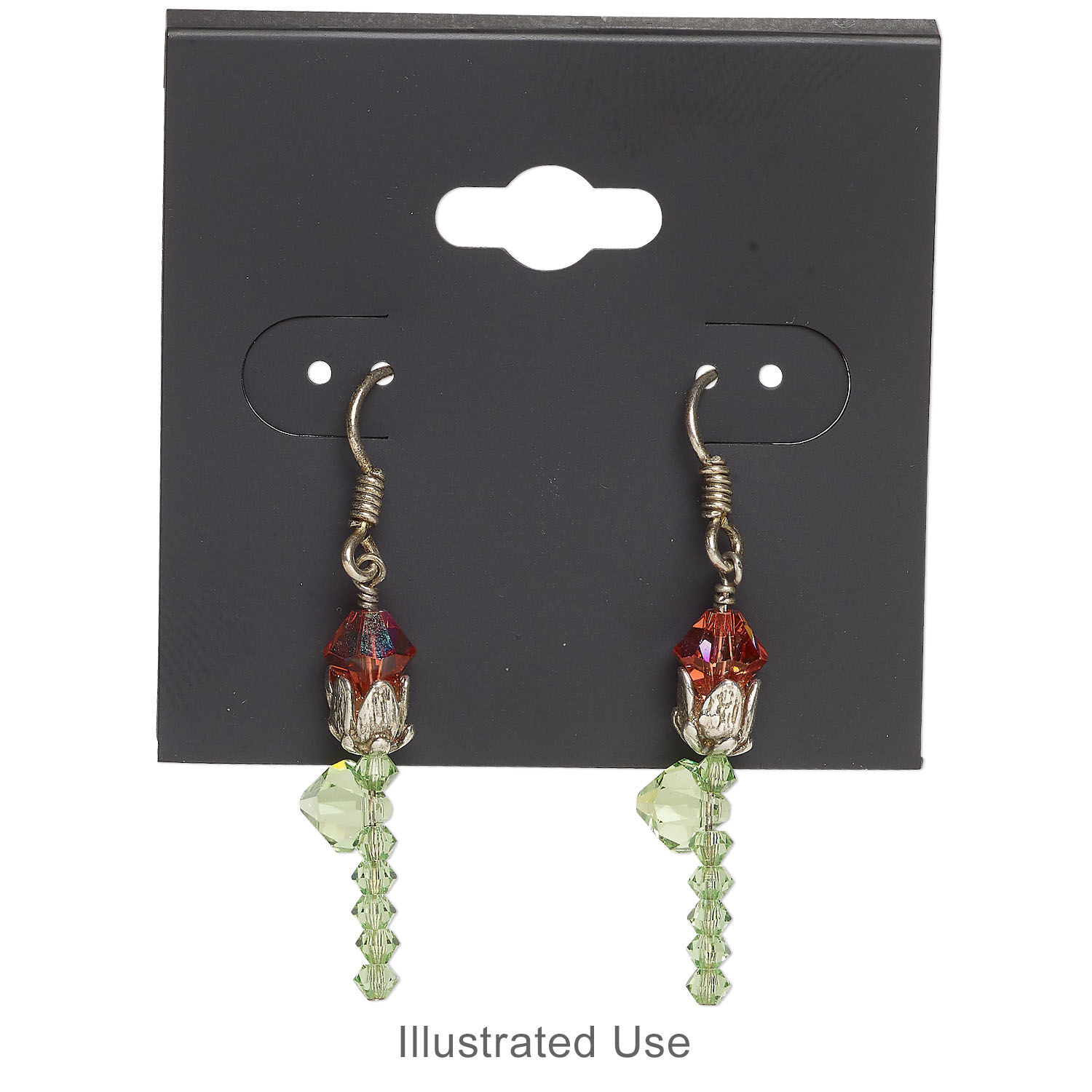 Earring cards provide an economical and effective method of displaying earrings, especially when coupled with earring display stands. Each card holds two pairs of earrings. Center hang tab fits most hooks and butterfly hangers.