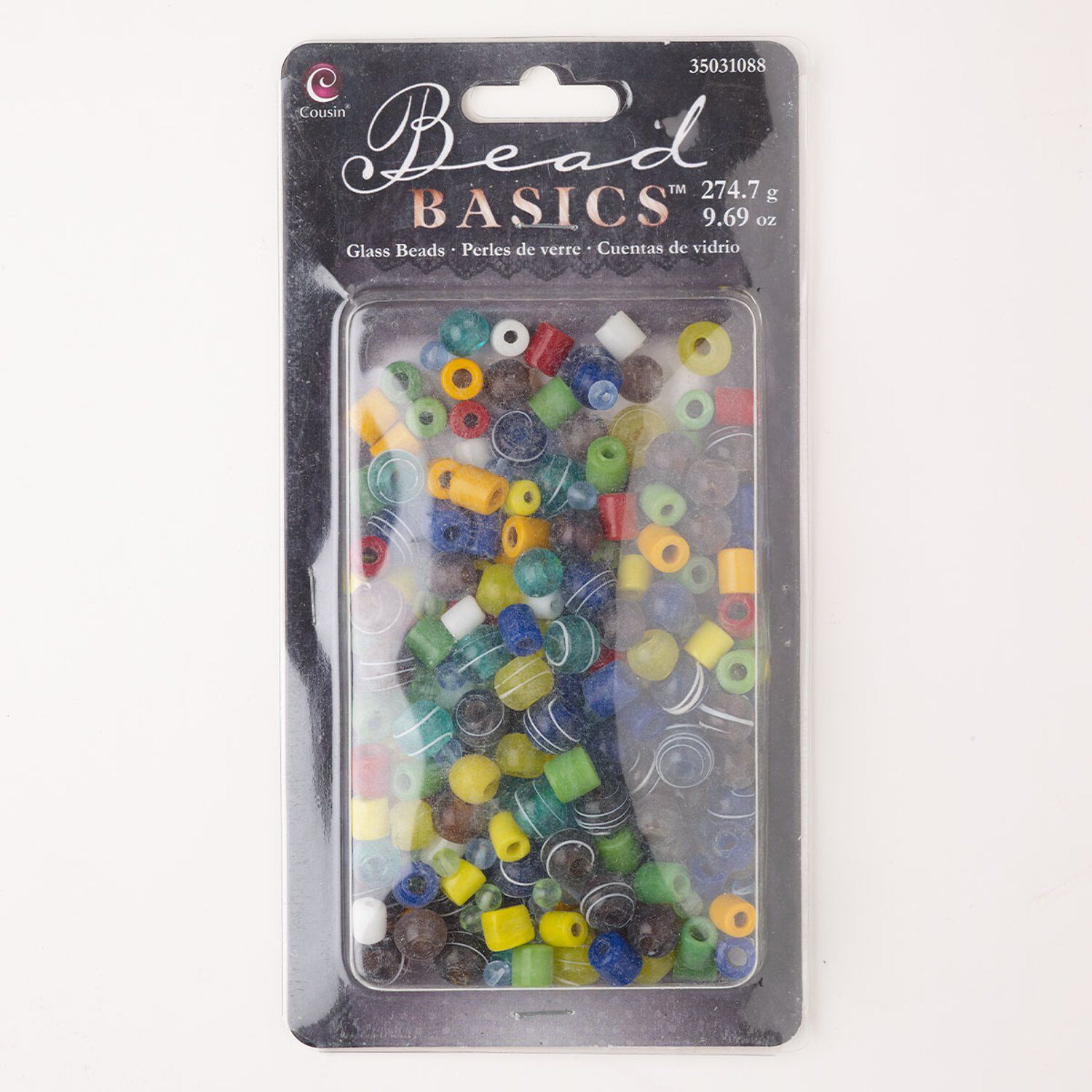 Package contains approximately 275 beads. Colors can include blue, yellow, orange and more. Some beads may have a swirl design. These beads may be lined with heavy amounts of kaolin (also called "China clay"), a fine white clay used to prevent molten glass from sticking to the steel rod during beadmaking. It can be easily removed with water.
