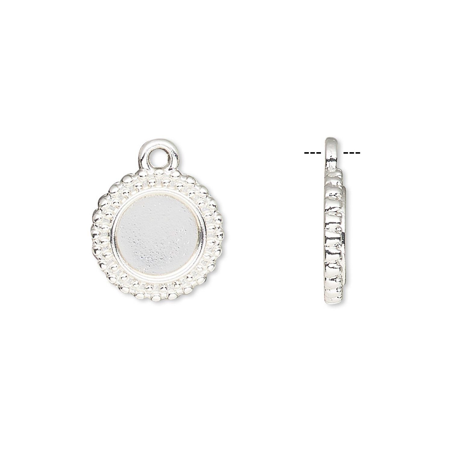 Drop, silver-finished brass, 13mm single-sided beaded round with 8mm round setting. Sold per pkg of 10.