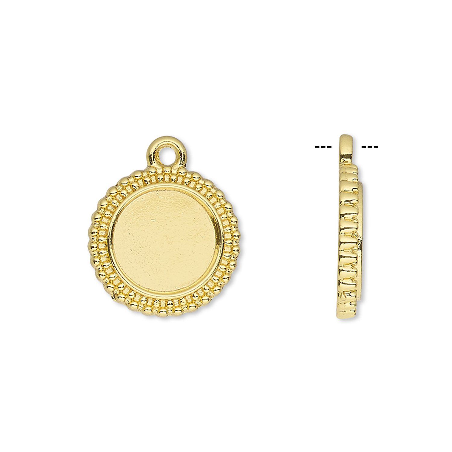 Drop, gold-finished brass, 15mm single-sided beaded round with 10mm round setting. Sold per pkg of 10.