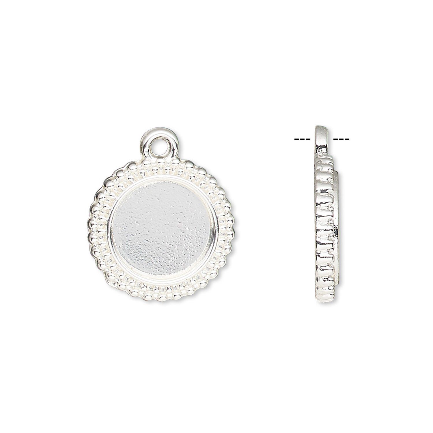 Drop, silver-finished brass, 15mm single-sided beaded round with 10mm round setting. Sold per pkg of 10.
