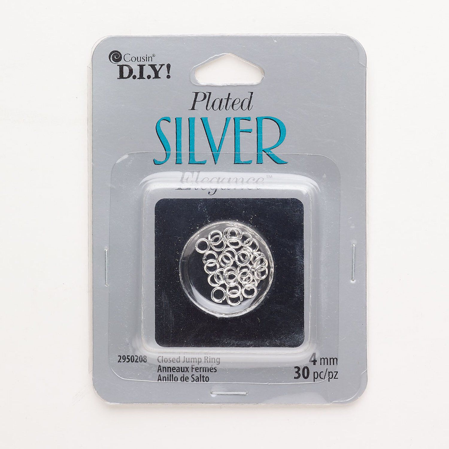 Jump ring, brass, pkg/30, silver plate, 4mm open round, 2.2mm inside diameter, 19 gauge.