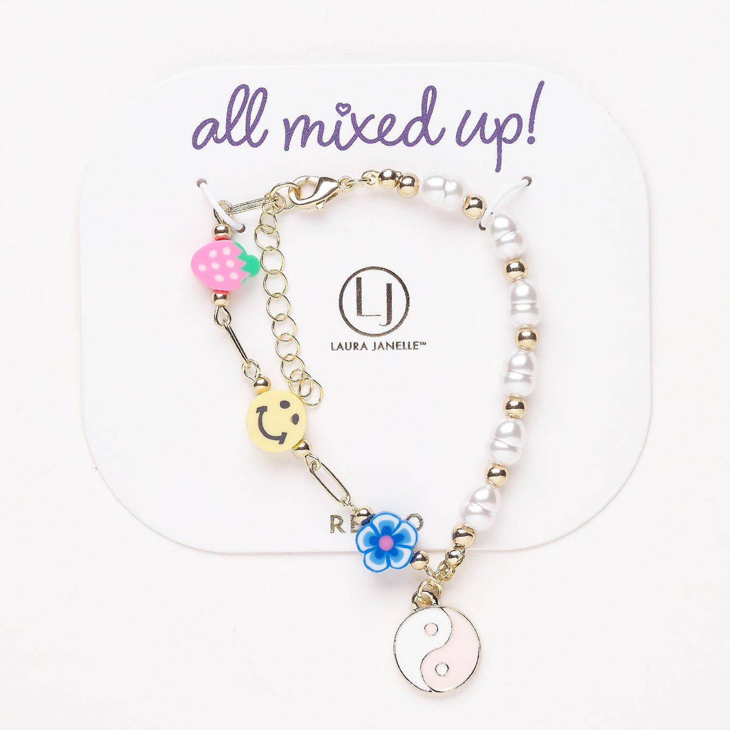 Bracelet, steel / brass / acrylic pearl, pkg/1, 6 inches with lobster claw clasp and 1-1/2-inch extender chain, gold finish and multicolored, Retro theme.