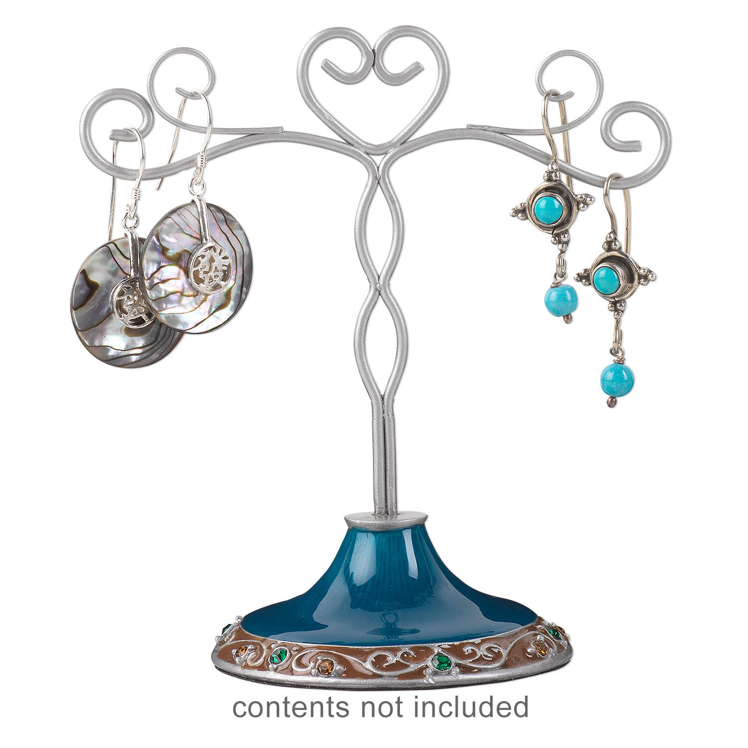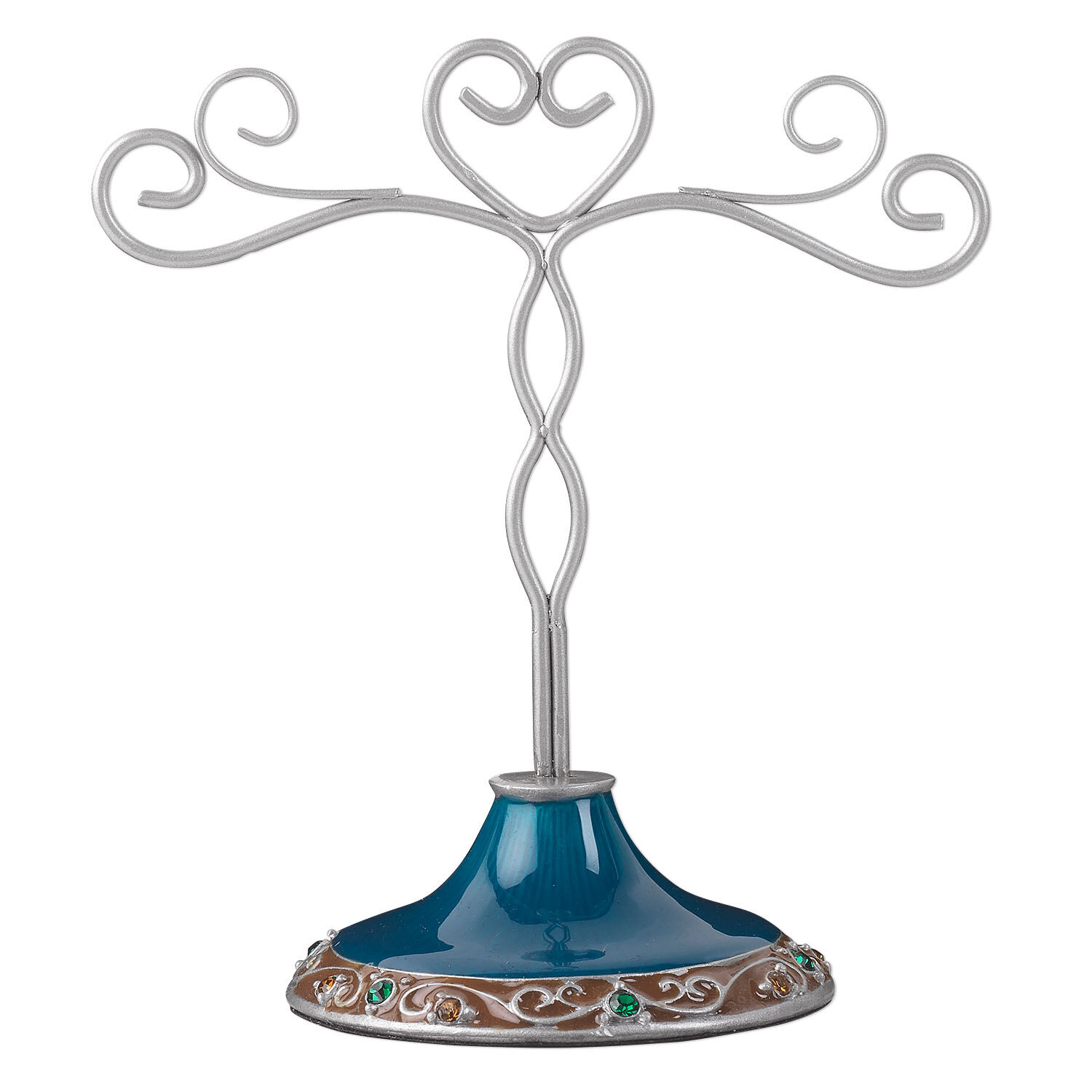 Colorful enameled jewelry display features hearts and rhinestones for an enchanting style. Metal jewelry displays are great for showcasing jewelry at home or in retail spaces.