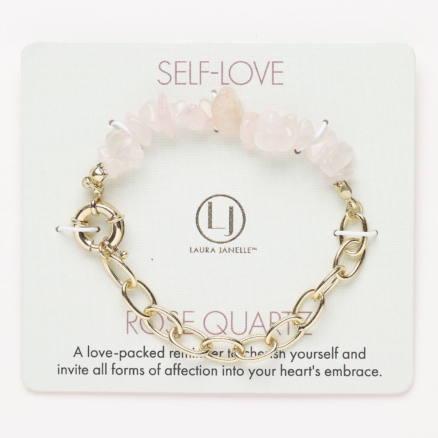 Bracelet features 7mm chain and 6-12mm rose quartz chips.