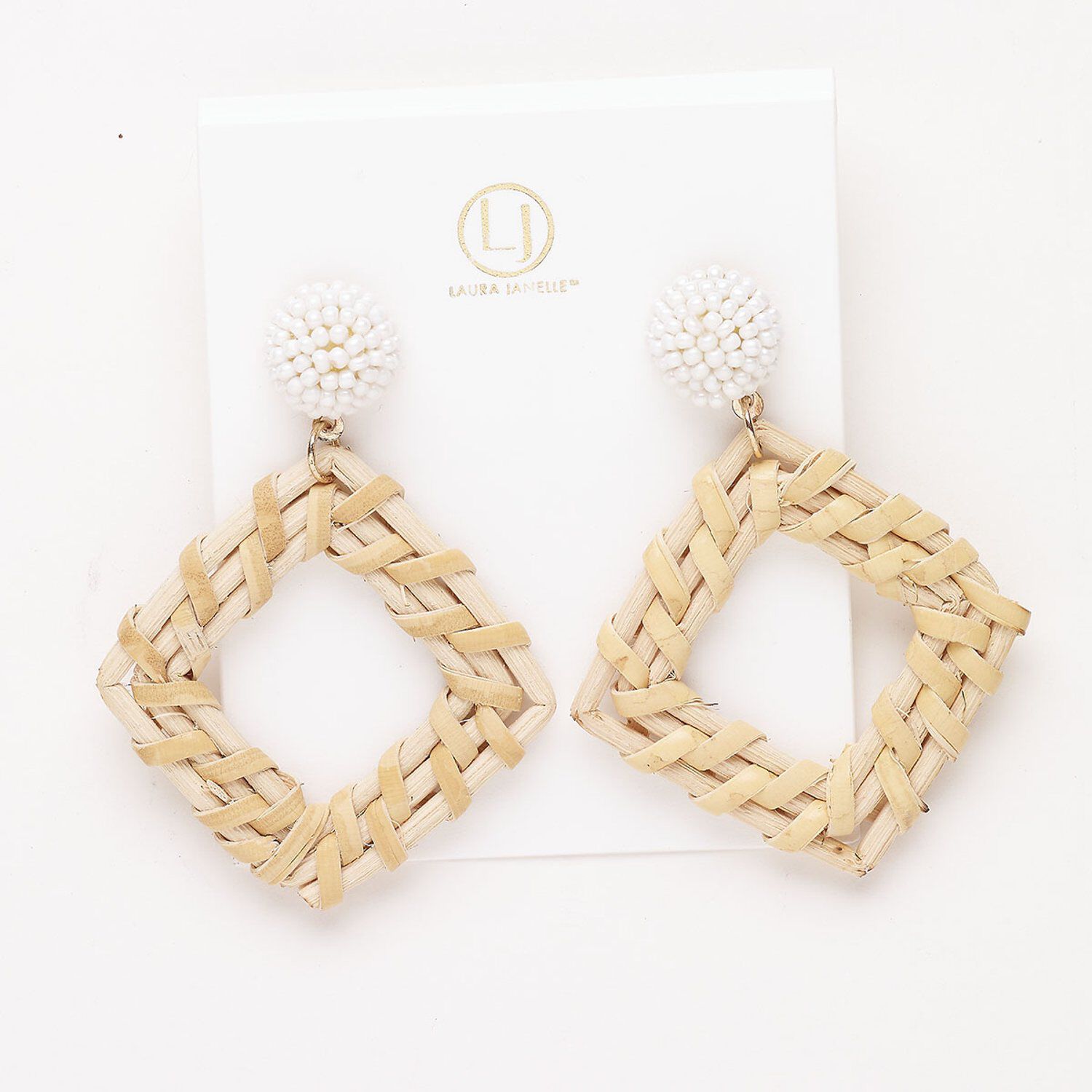 Earring 1pkg2, 2.5 inch woven diamond earstud / round / comfort clutch, gold-finished steel / glass / rattan white / brown 1 pair