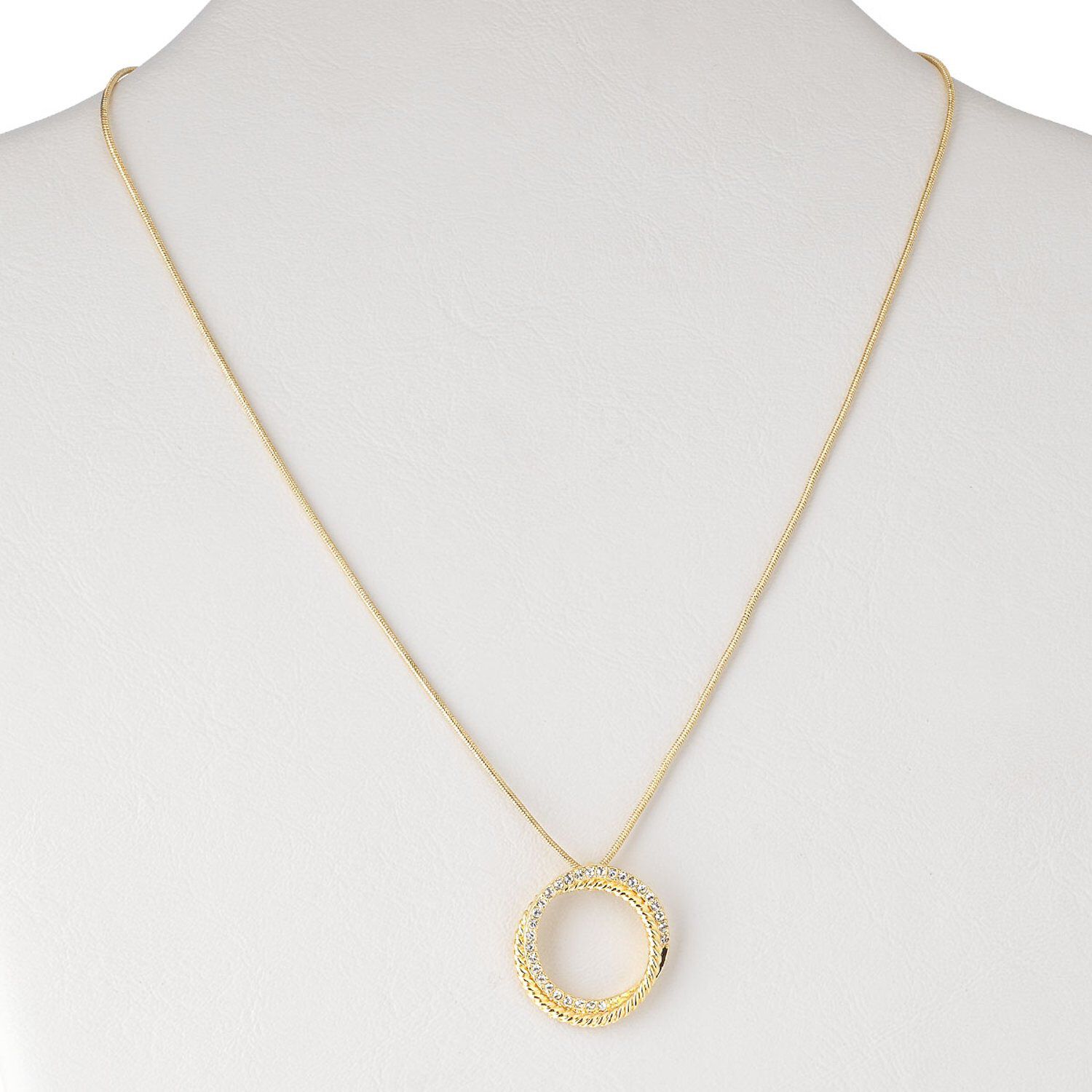 Necklace, gold-finished pewter (tin-based alloy) and glass rhinestone, clear, 27x26mm double ring pendant, 18-inch snake chain with lobster claw clasp. Sold individually.