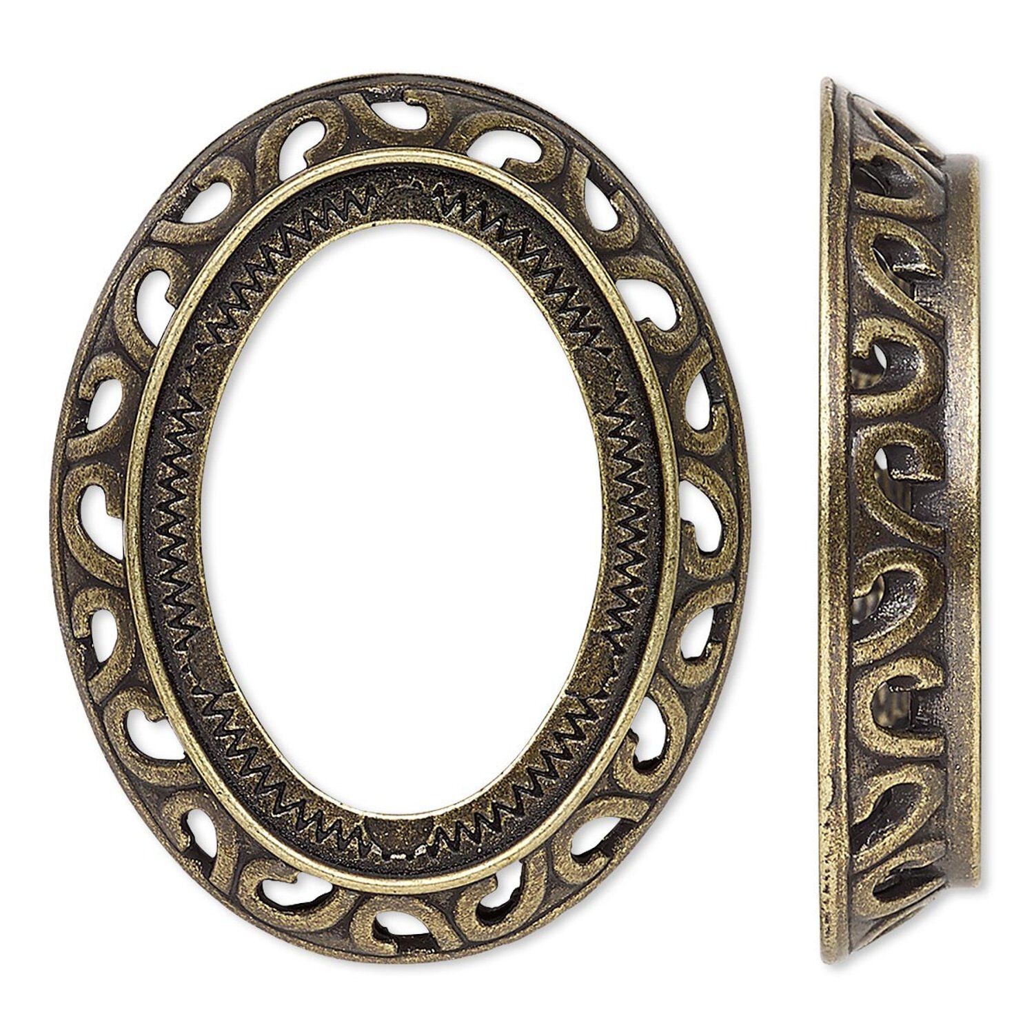 Component, antique gold-plated brass, 38x30mm oval with swirl design and 30x22mm oval setting. Sold per pkg of 4.