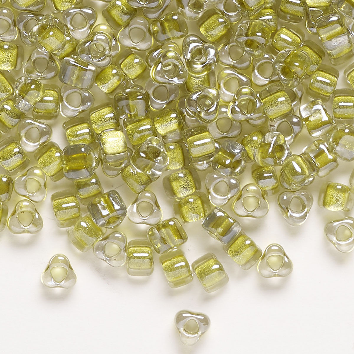 Seed bead, Miyuki, glass, transparent clear color-lined yellow green, (1125), #5 triangle. Sold per 25-gram pkg.