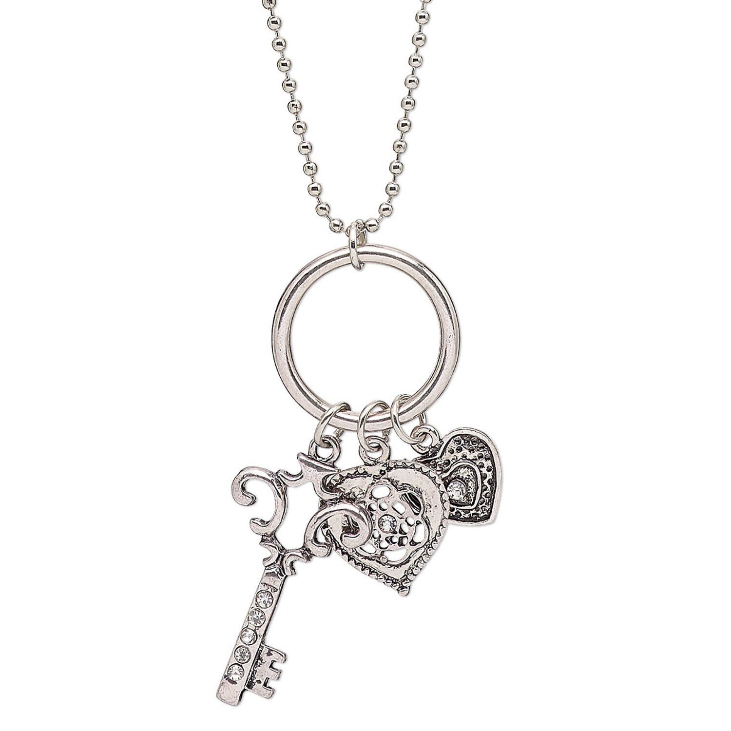 Necklace, glass rhinestone with antique imitation rhodium-plated brass and pewter (tin-based alloy), clear, 37x16mm single-sided key with ring and heart charms, 36-inch continuous loop. Sold individually.