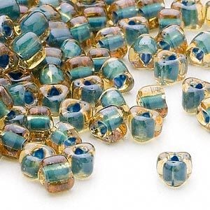 Seed bead, Miyuki, glass, transparent amber yellow color-lined teal, (TR1169), #5 triangle. Sold per 250-gram pkg.
