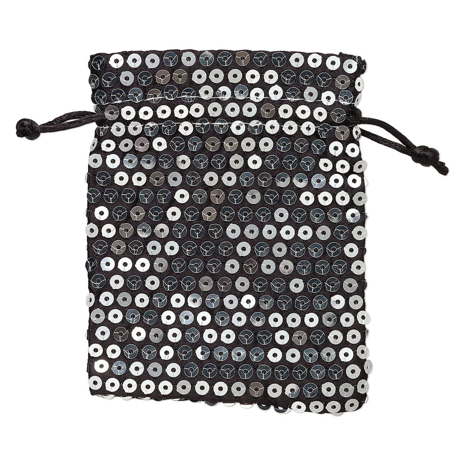 Pouch, satin and plastic sequins, black and silver, 4-3/4 x 3-3/4 inches. Sold per pkg of 3.